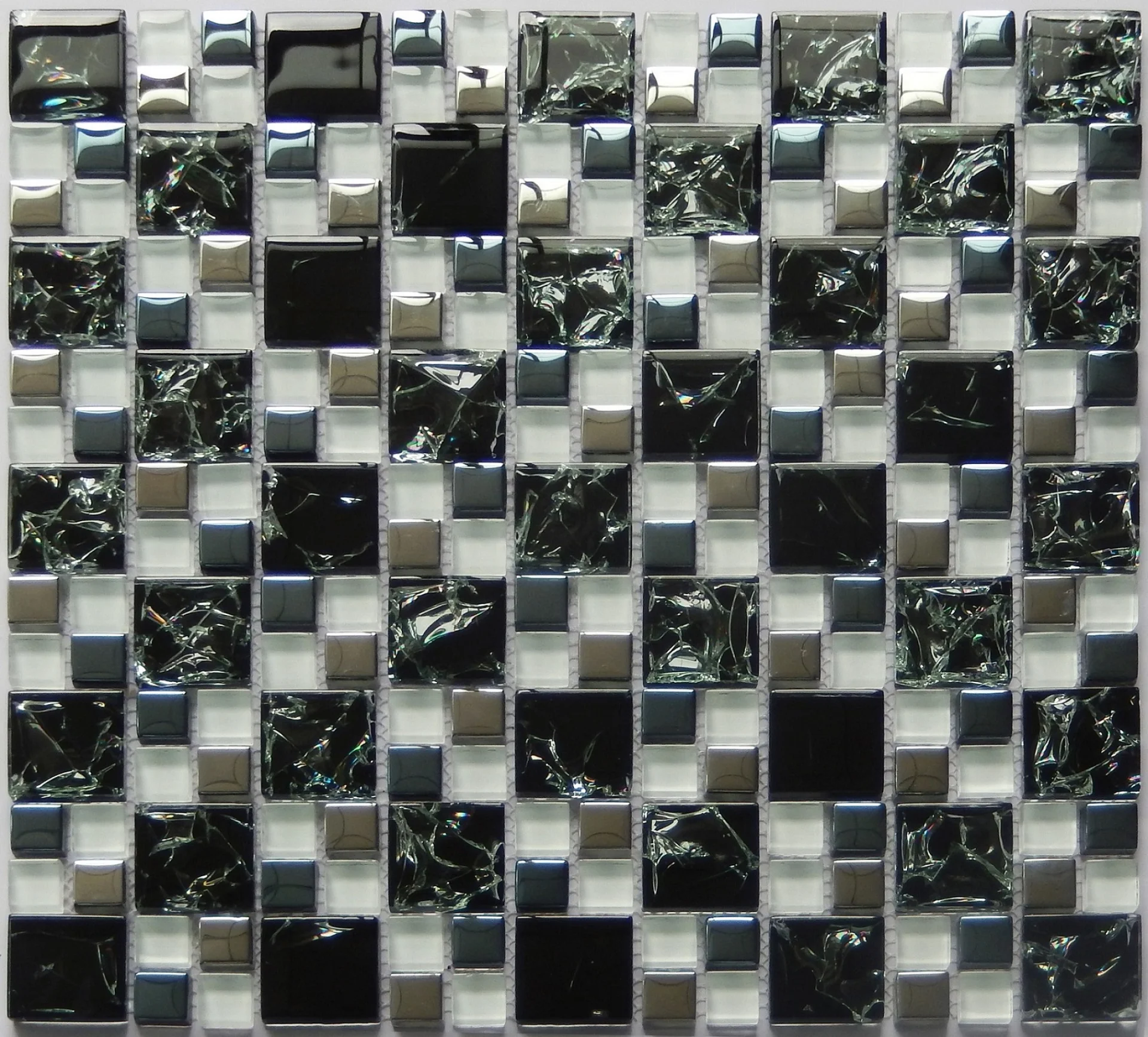MOZAIC DIN STICLA PE PLASA BLA38083 - 30.5X30.5 cm, montat pe plasă, finisaj lucios, aspect modern în tonuri de negru și argintiu, ideal pentru decor interior.