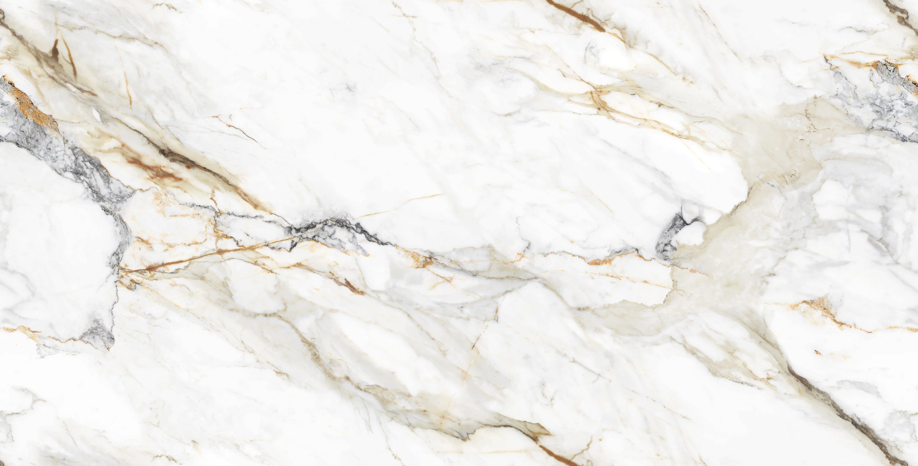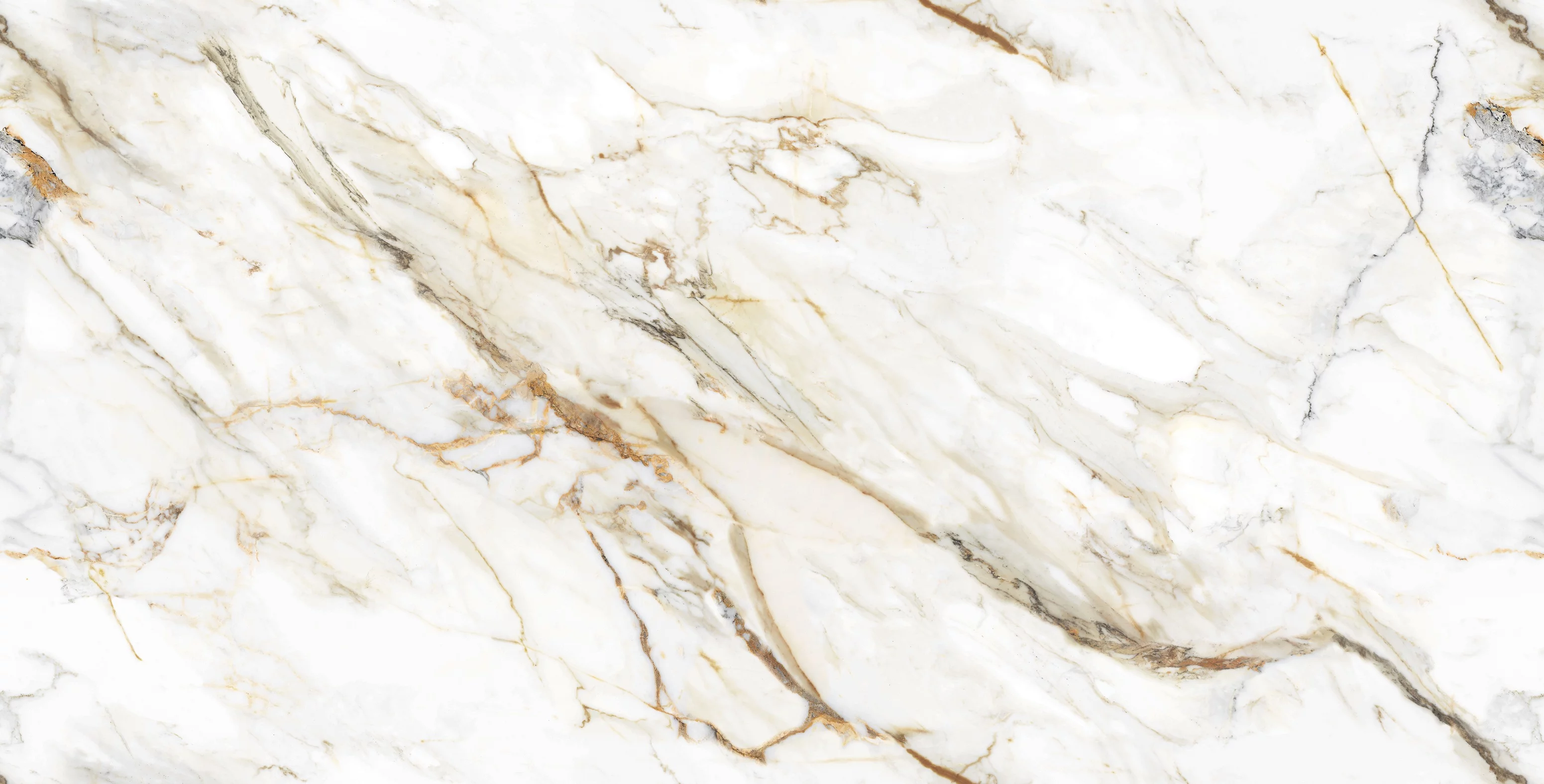 GRESIE ENDLESS CALCUTTA WAVE - 80X160 cm, porțelanată, lucioasă, cu design endless (continuu), finisaj marmură albă cu nervuri aurii și gri. Ideală pentru interioare elegante și moderne, compatibilă cu încălzirea în pardoseală.