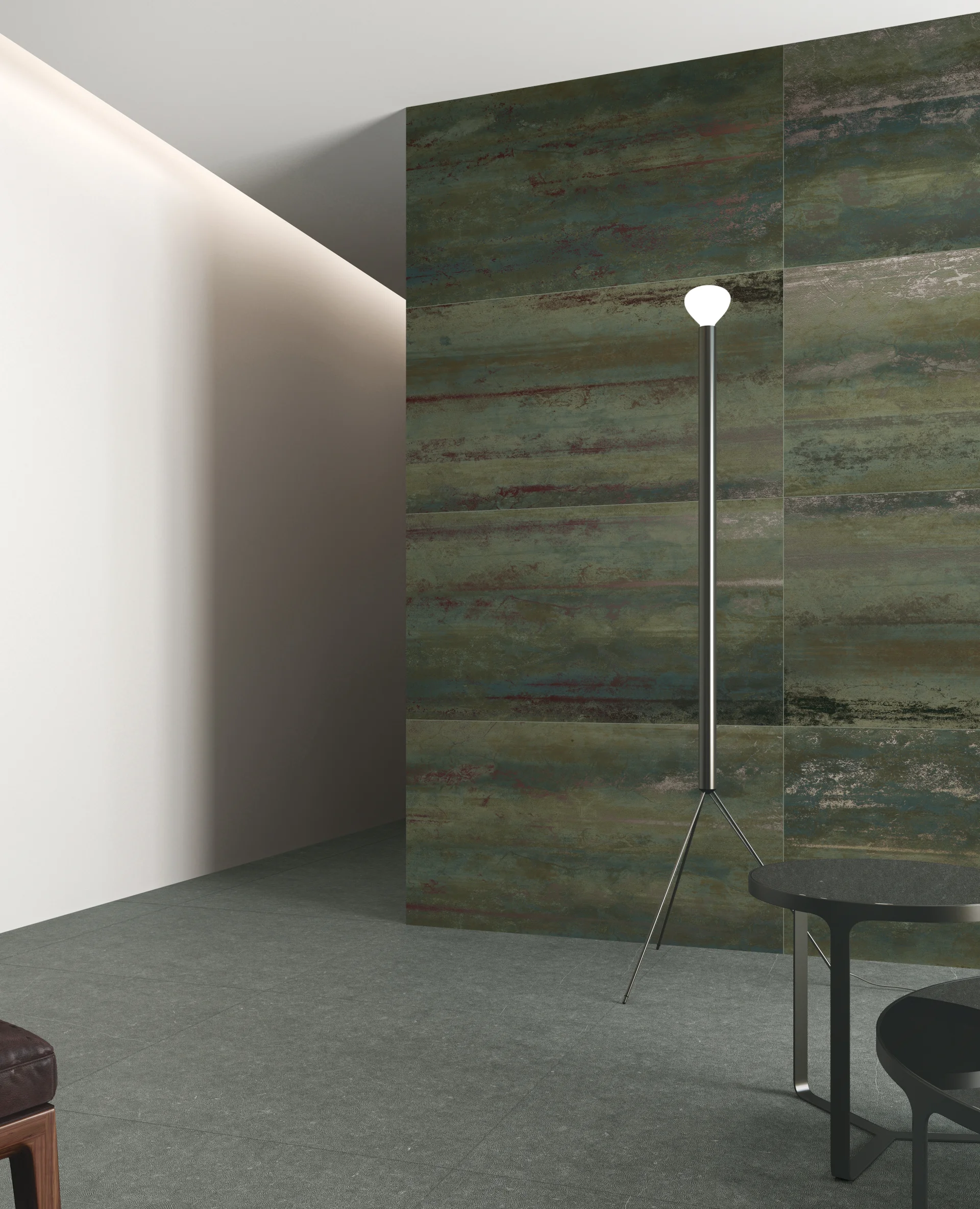 Gresia ETHOS VERDE GRANDE - aduce un aer contemporan și sofisticat în orice spațiu, printr-un design ce combină nuanțele de verde mineral cu accente ruginii și efecte metalice discrete.