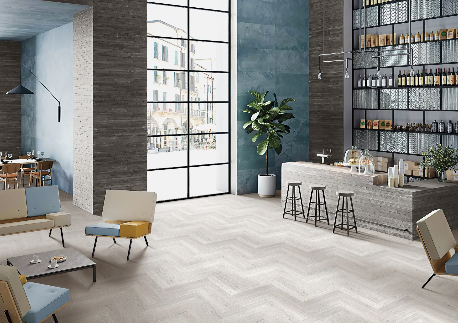 Modelul tip herringbone (parchet în spic) adaugă rafinament și dinamism vizual, oferind un decor elegant atât pentru locuințe, cât și pentru spații comerciale.