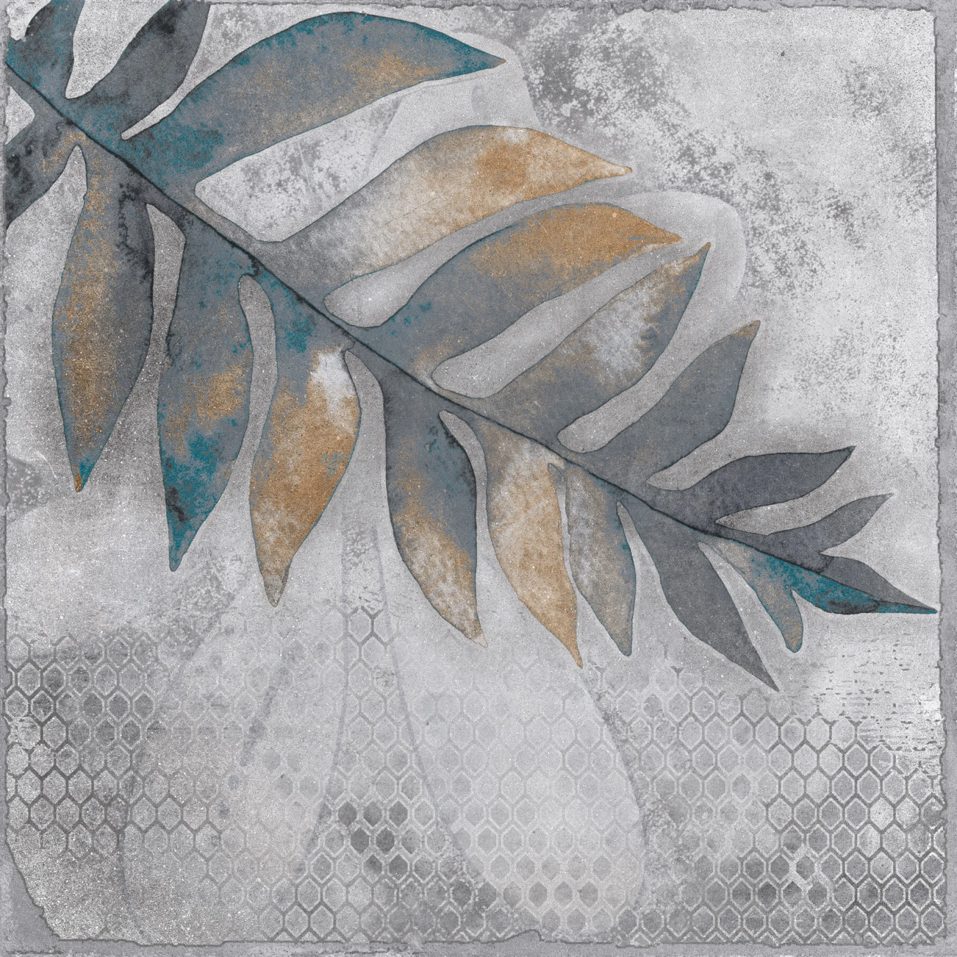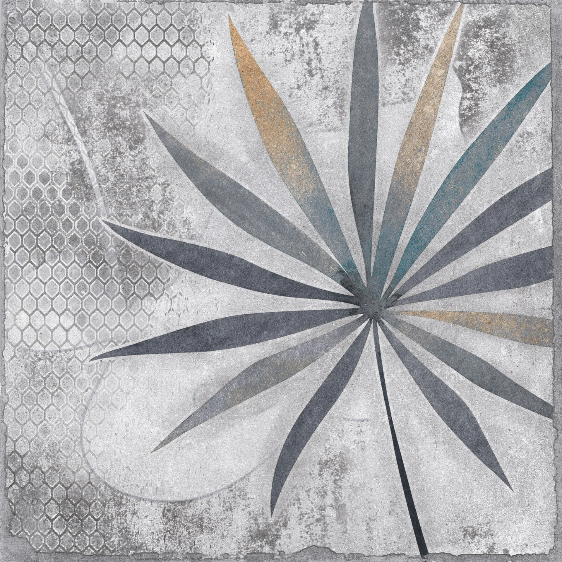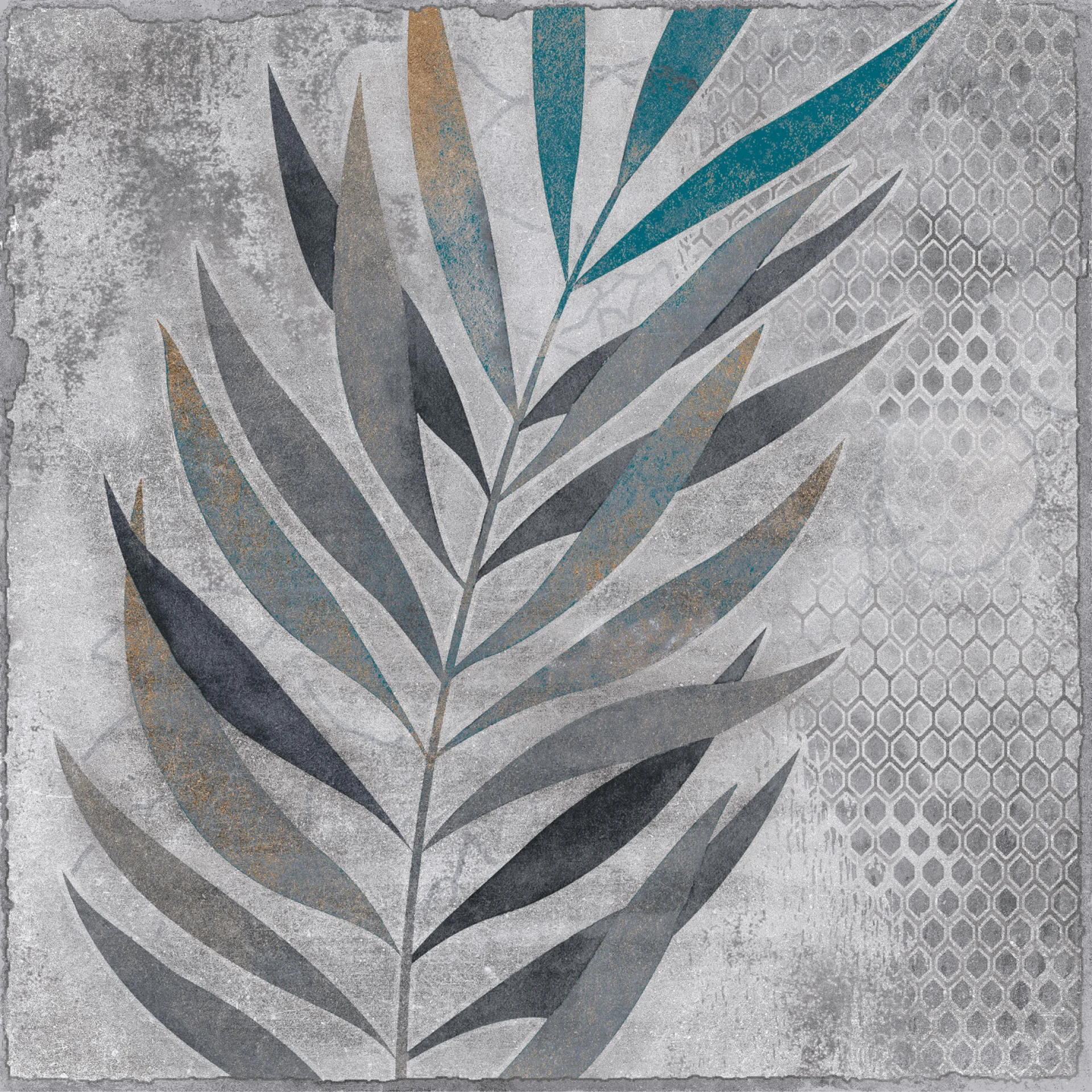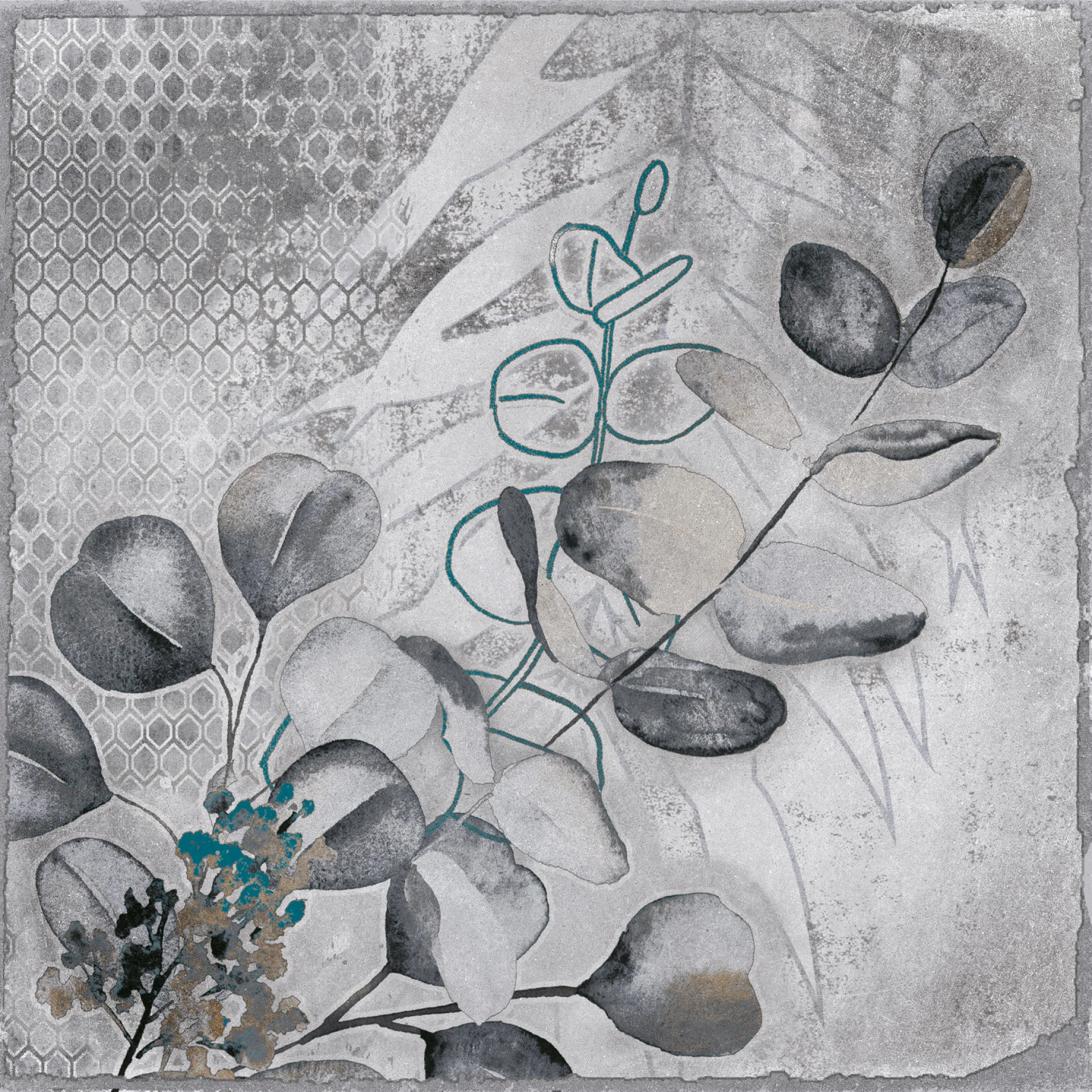Cu un fundal gri-argintiu subtil texturat și motive vegetale stilizate în nuanțe contrastante (bej, antracit, verde-turcoaz), această placă este ideală pentru amenajări creative.