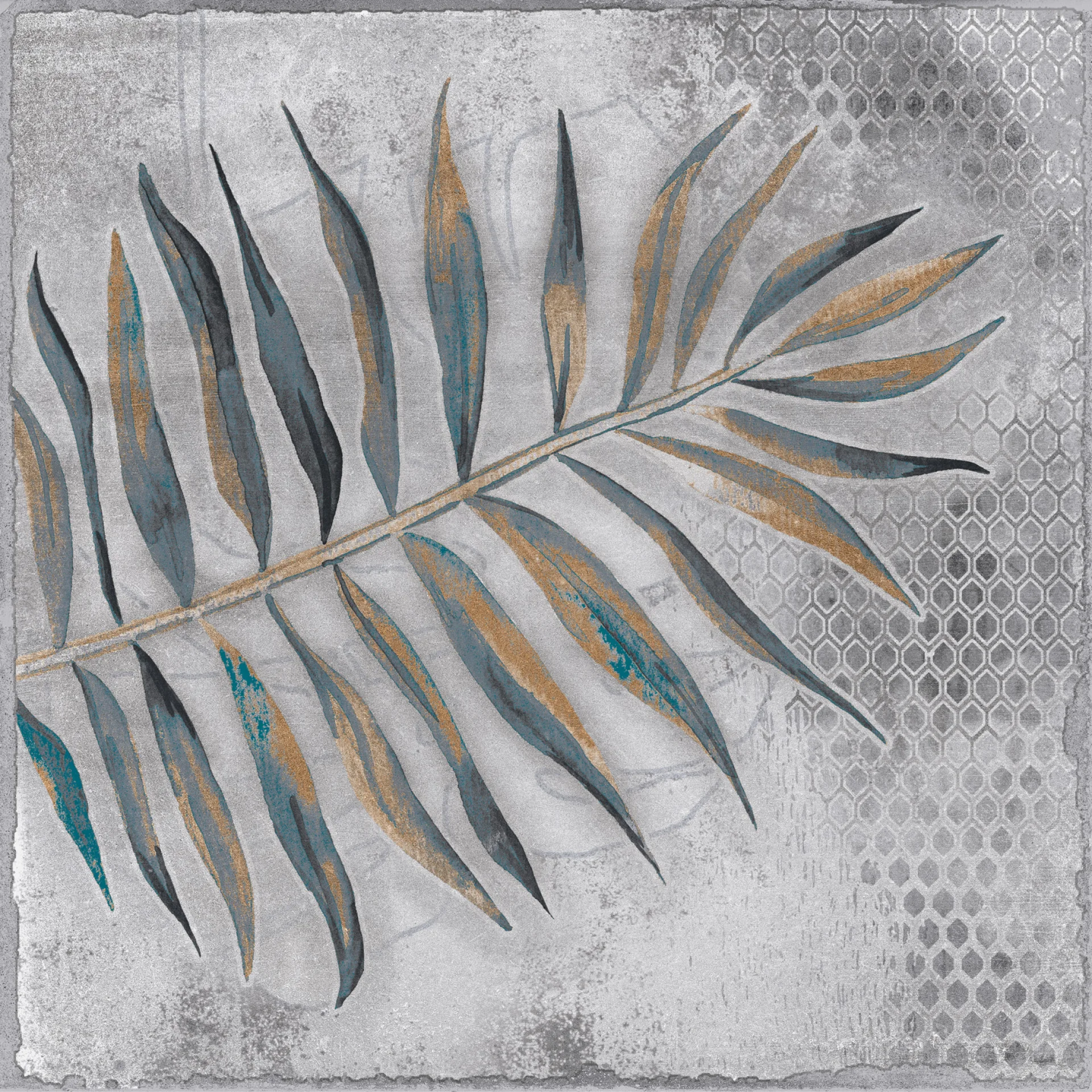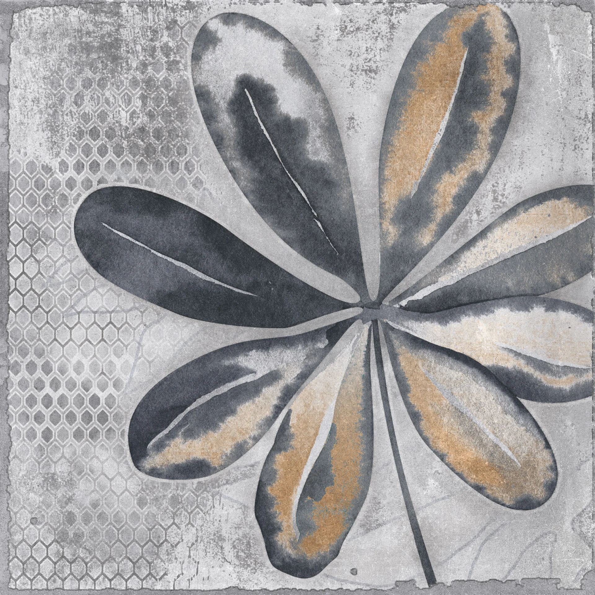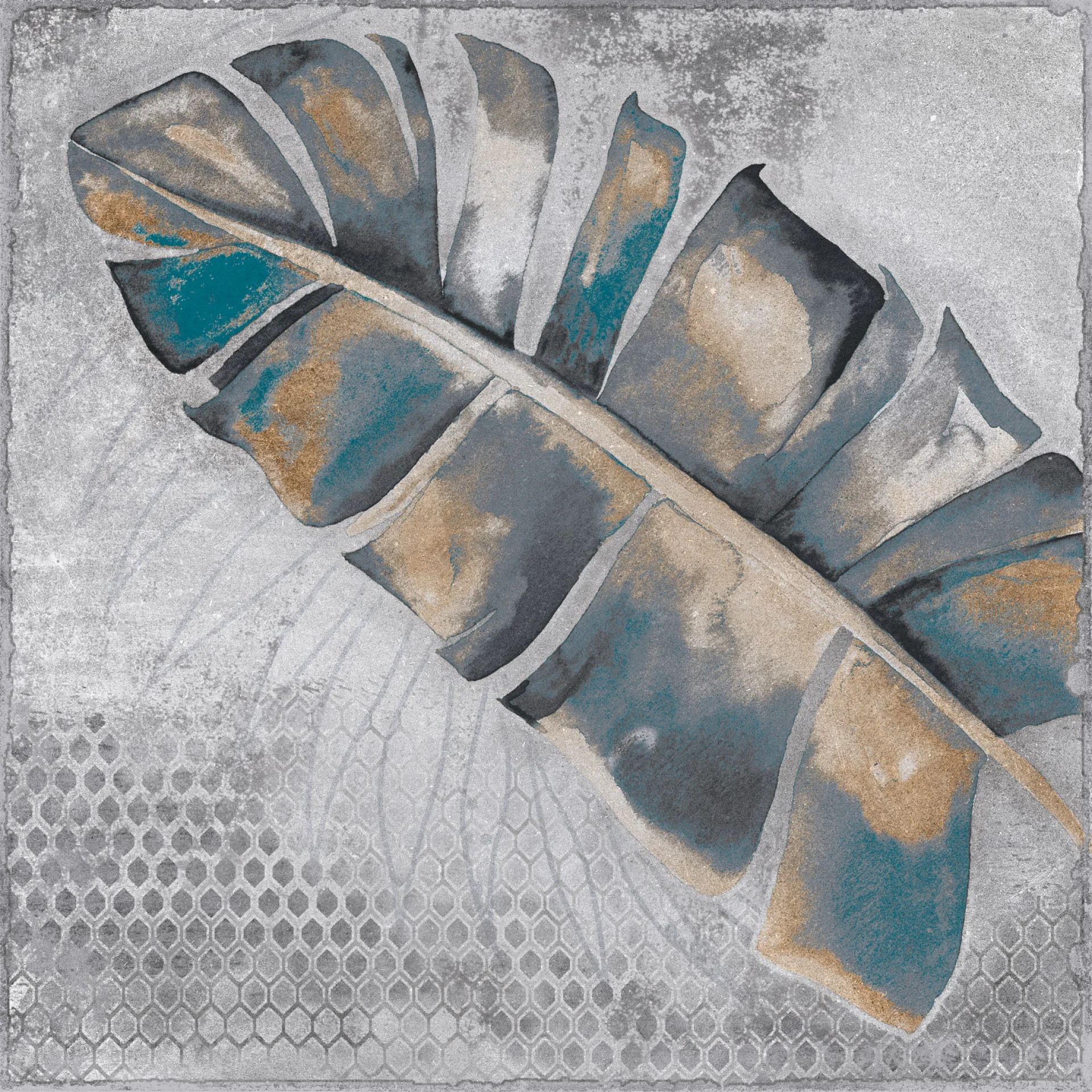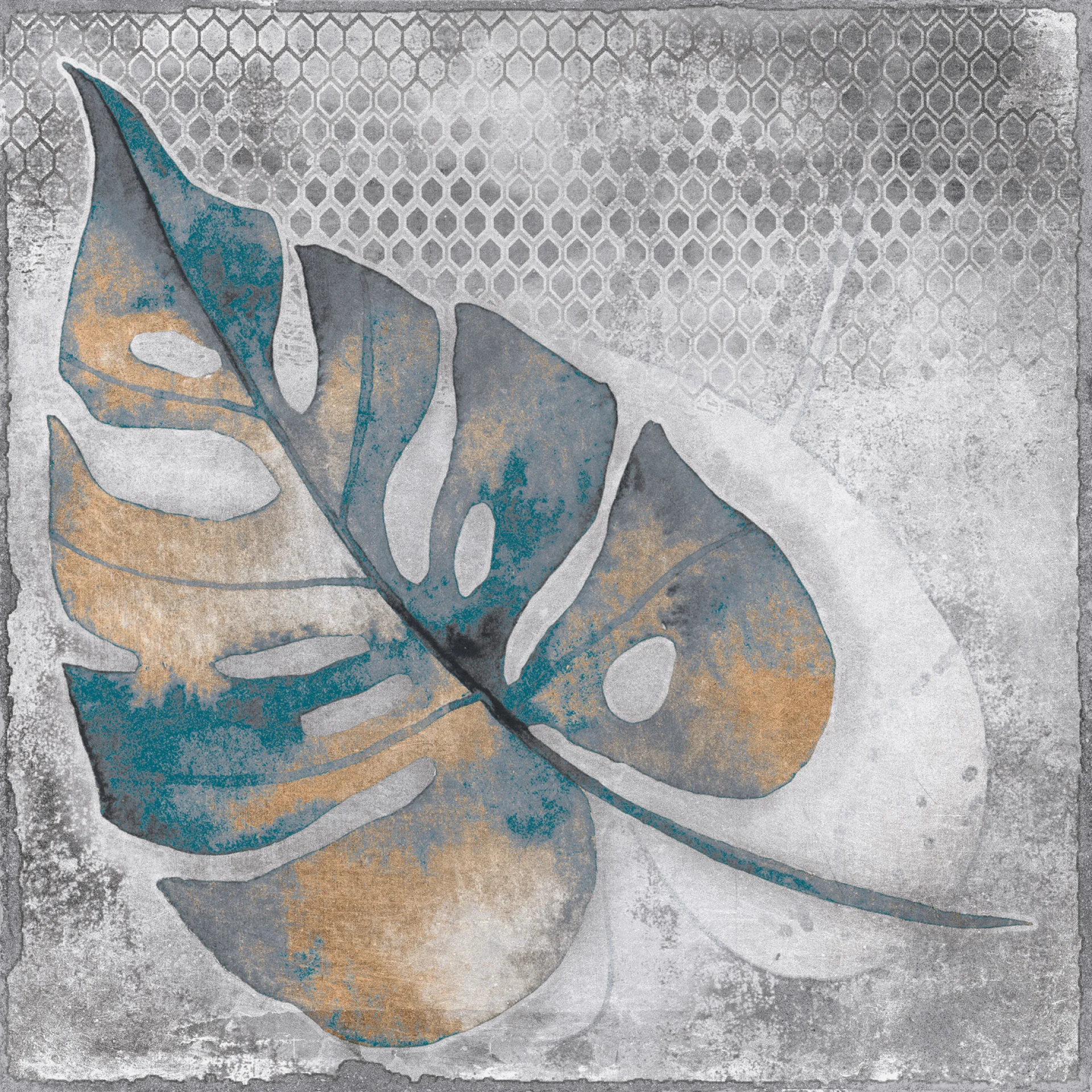 Cu un fundal gri-argintiu subtil texturat și motive vegetale stilizate în nuanțe contrastante (bej, antracit, verde-turcoaz), această placă este ideală pentru amenajări creative.