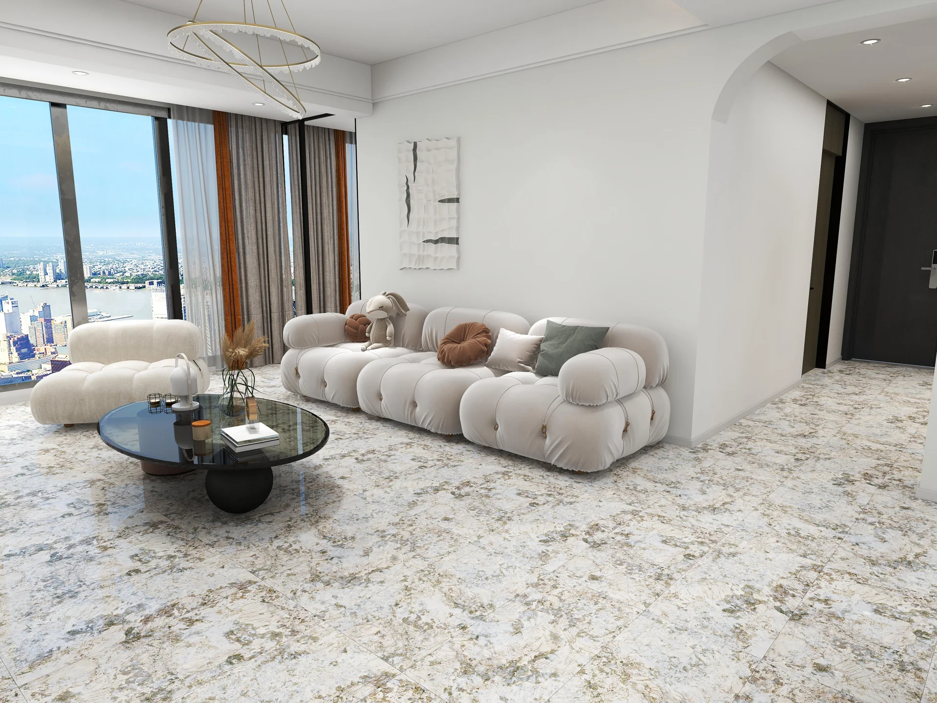 Gresia GOLD SUVERETO (GS48008) este o gresie porțelanată premium, ce combină tonuri de alb, bej și gri pal cu inserții aurii fine care creează un efect sofisticat și elegant.