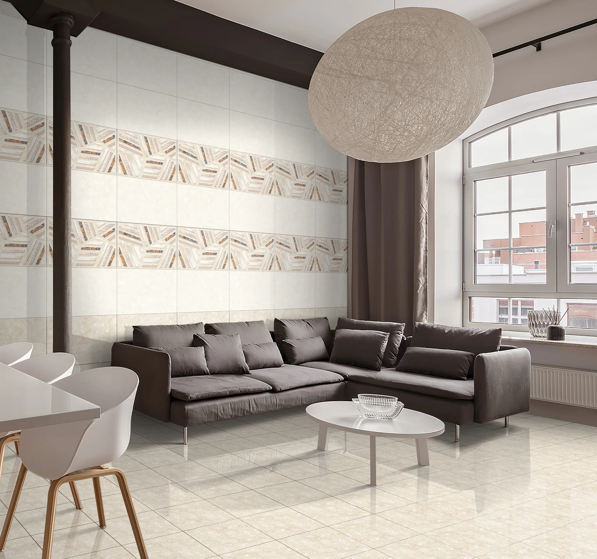 Faianța DEVLON 2034 HL 1 este un element decorativ remarcabil, ce îmbină nuanțele calde de crem cu un design geometric în relief, conturat de inserții grafice fine în tonuri aurii, brune și alb perlat. Suprafața glazurată lucioasă amplifică luminozitatea spațiului, în timp ce modelul ornamental adaugă rafinament și caracter peretelui.