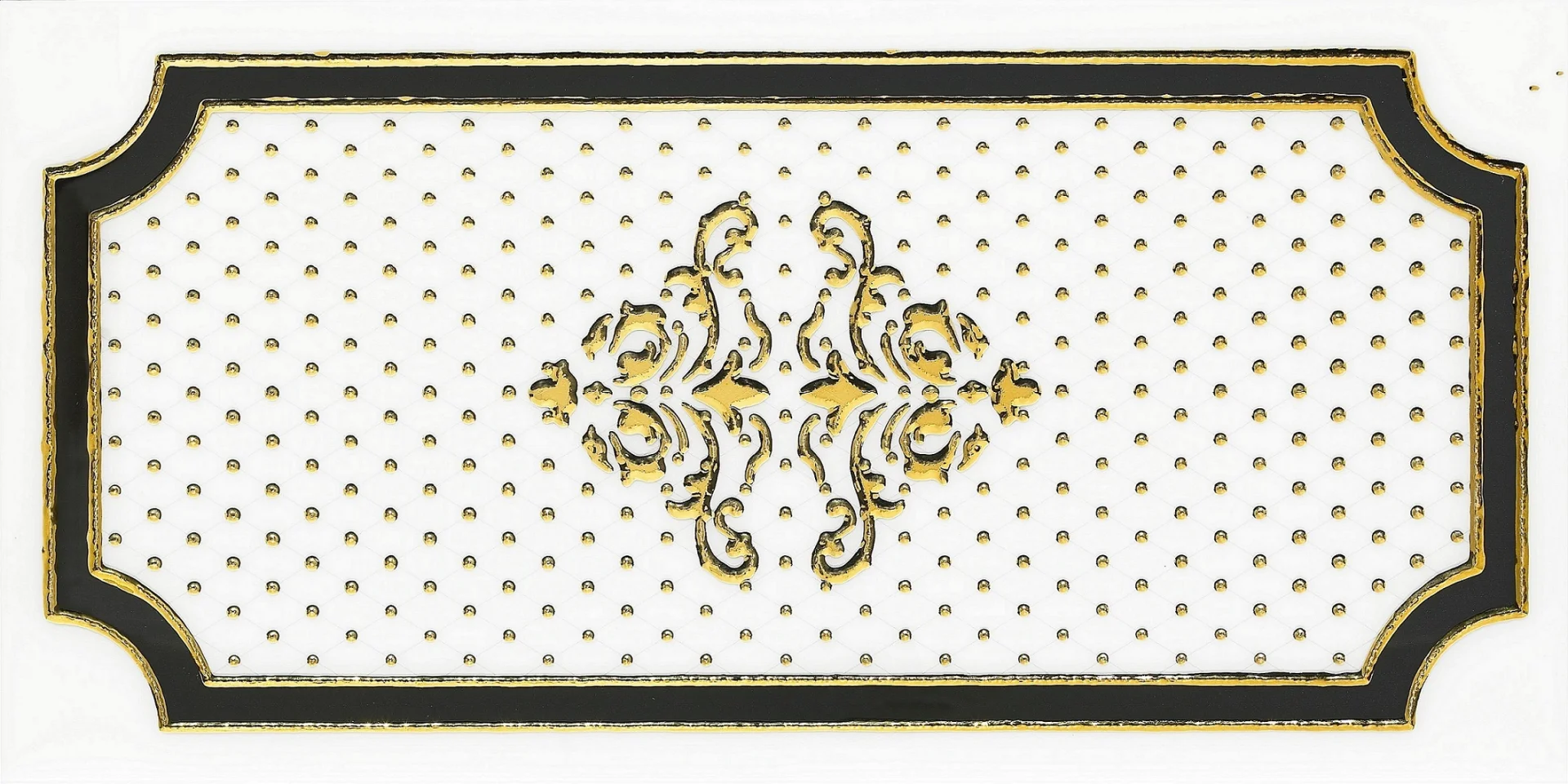 PLACA DECOR FAIANTA FC-36PH2106 aduce un plus de eleganță oricărui interior, prin detaliile sale rafinate și combinația armonioasă de auriu, alb și negru.