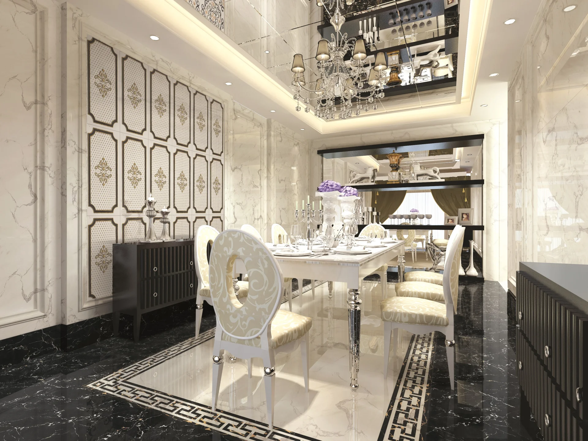 Decorul central în stil baroc, însoțit de un model geometric tip „capitonaj” cu puncte aurii în relief, creează o atmosferă luxoasă și sofisticată.