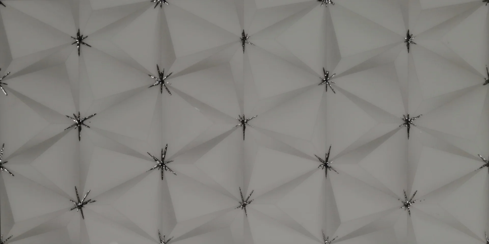 Fundalul alb lucios este completat de inserții fine aurii sub formă de stea sau cristale, amplasate simetric la intersecția elementelor în relief, creând un efect vizual sofisticat și modern.