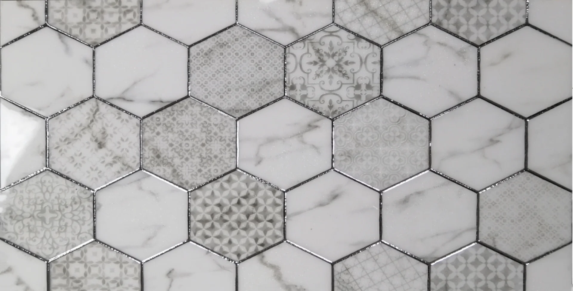 PLACA DECOR FAIANTA FC-36SBG513 - 30X60 cm, portelanata, glazurata, rectificata, aspect de mozaic hexagonal gri și alb, finisaj lucios și inserții argintii, eleganță contemporană pentru spații moderne.