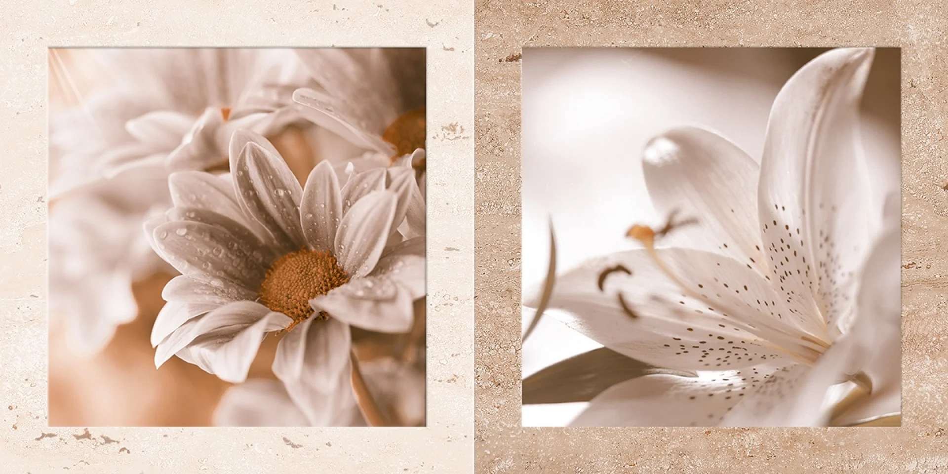Faianta TRAVERTINE LILY 30186-HL-TV EVIA este un decor ceramic cu finisaj mat și imprimeu floral în nuanțe sepia, ce evocă naturalețea și delicatețea florilor de crin și margarete.