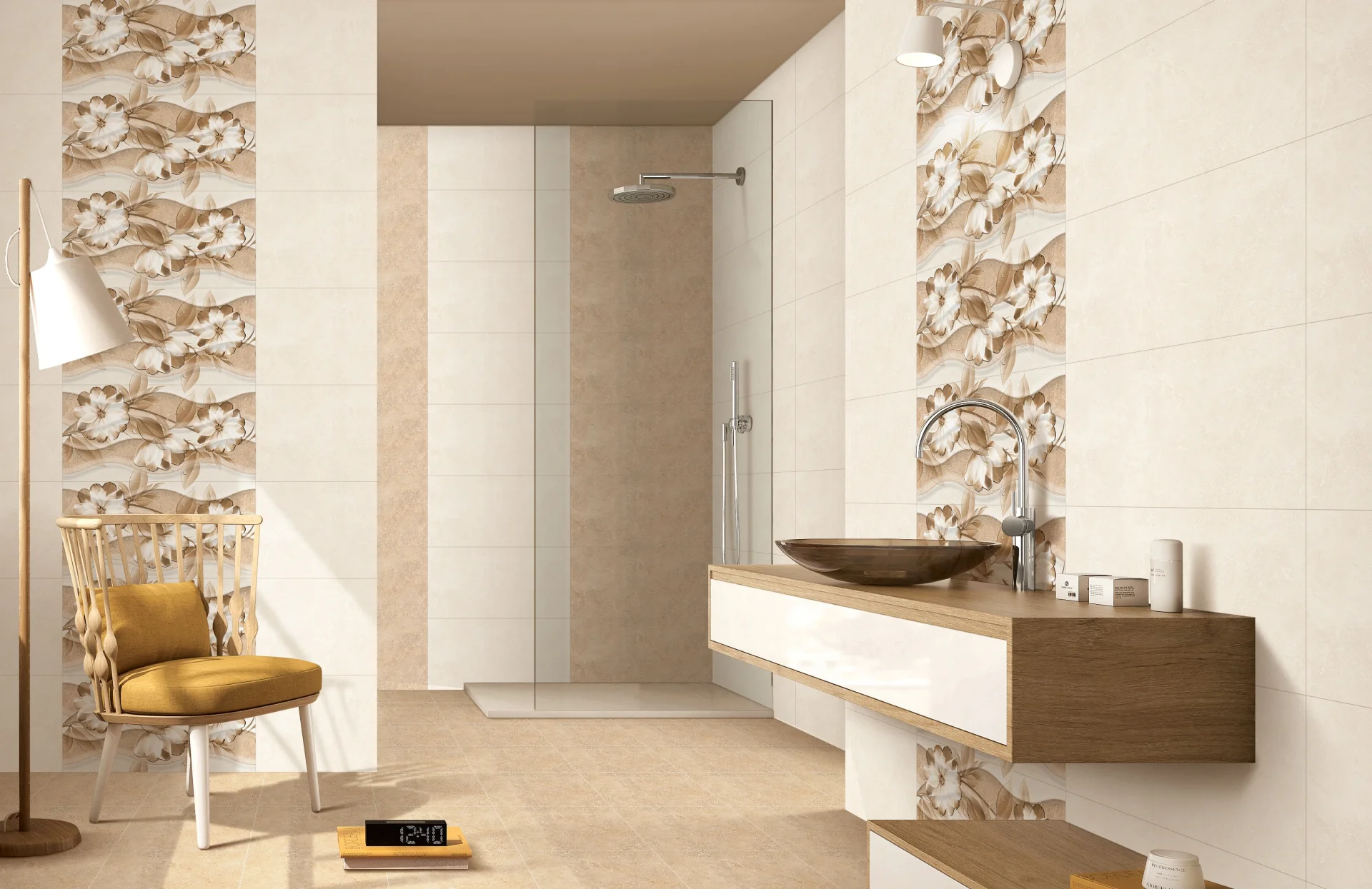 Designul floral ondulat se combină armonios cu modelele de bază din aceeași colecție, fiind ideal pentru a crea zone de accent în baie sau bucătărie.