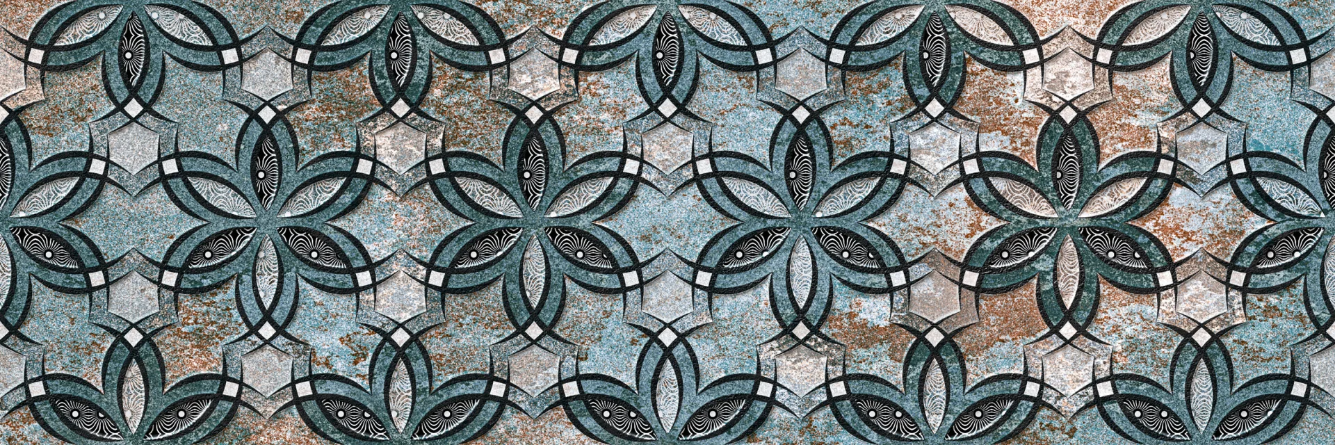 FAIANTA HYDRA LIFE AC-13234 HL1 - 25X75 cm, ceramica glazurată, rectificata, suprafata mată, finisaj în relief, cu model geometric floral și culori rustice în tonuri de albastru oxidat, cupru și negru.