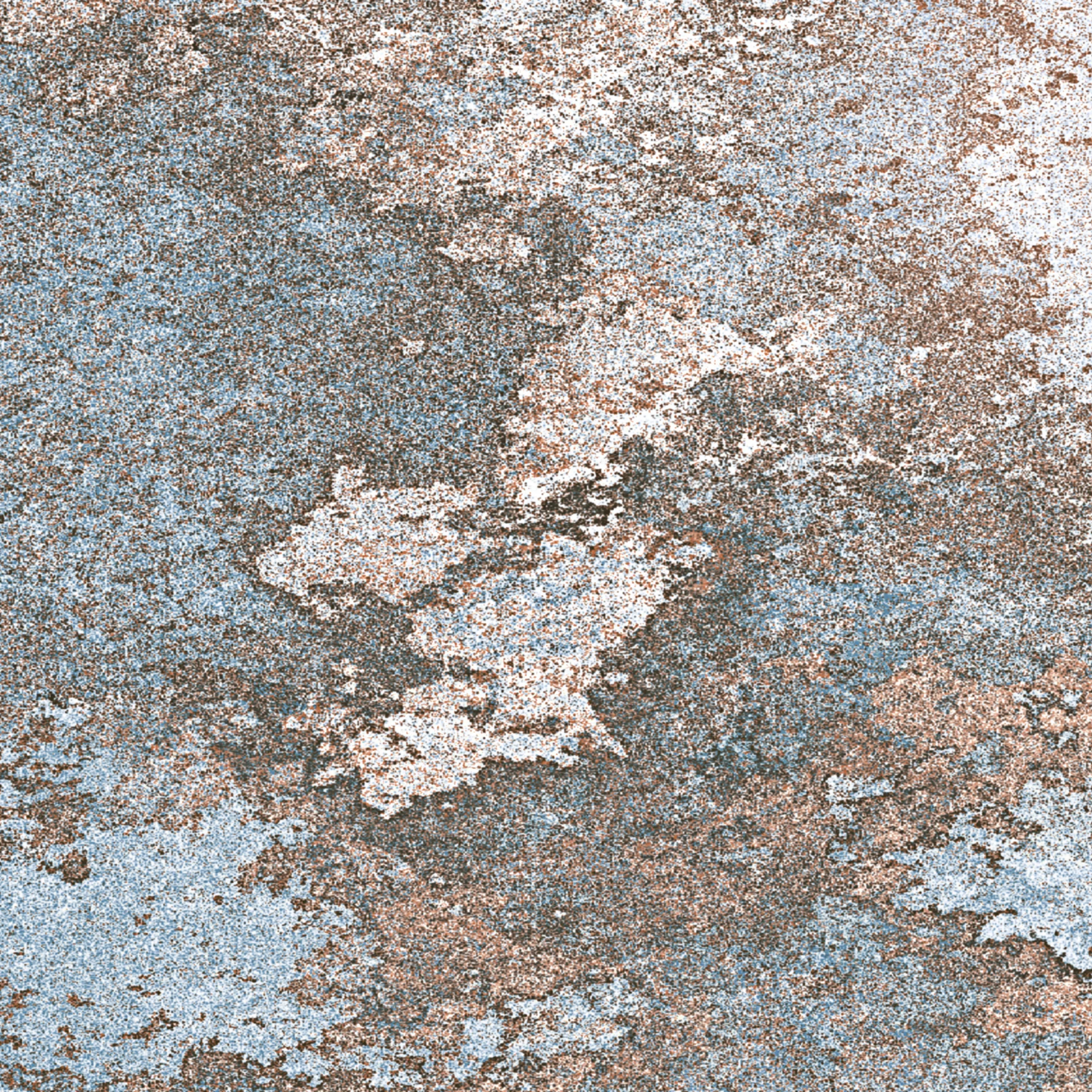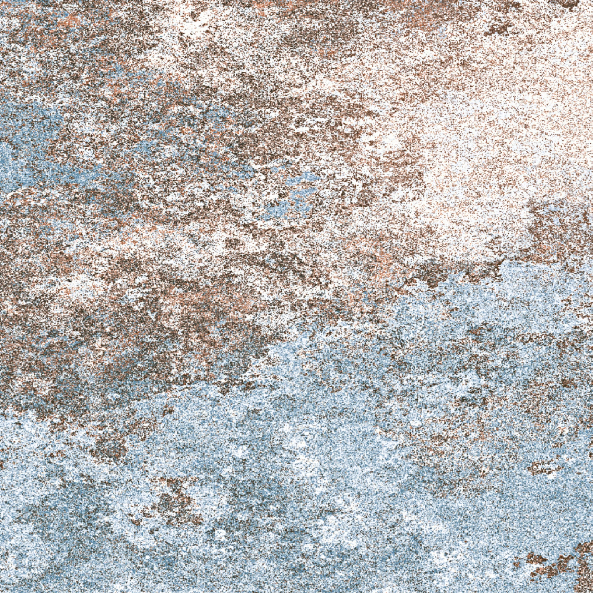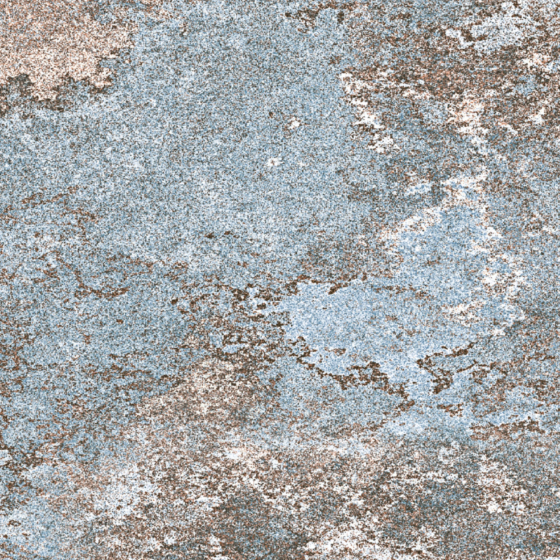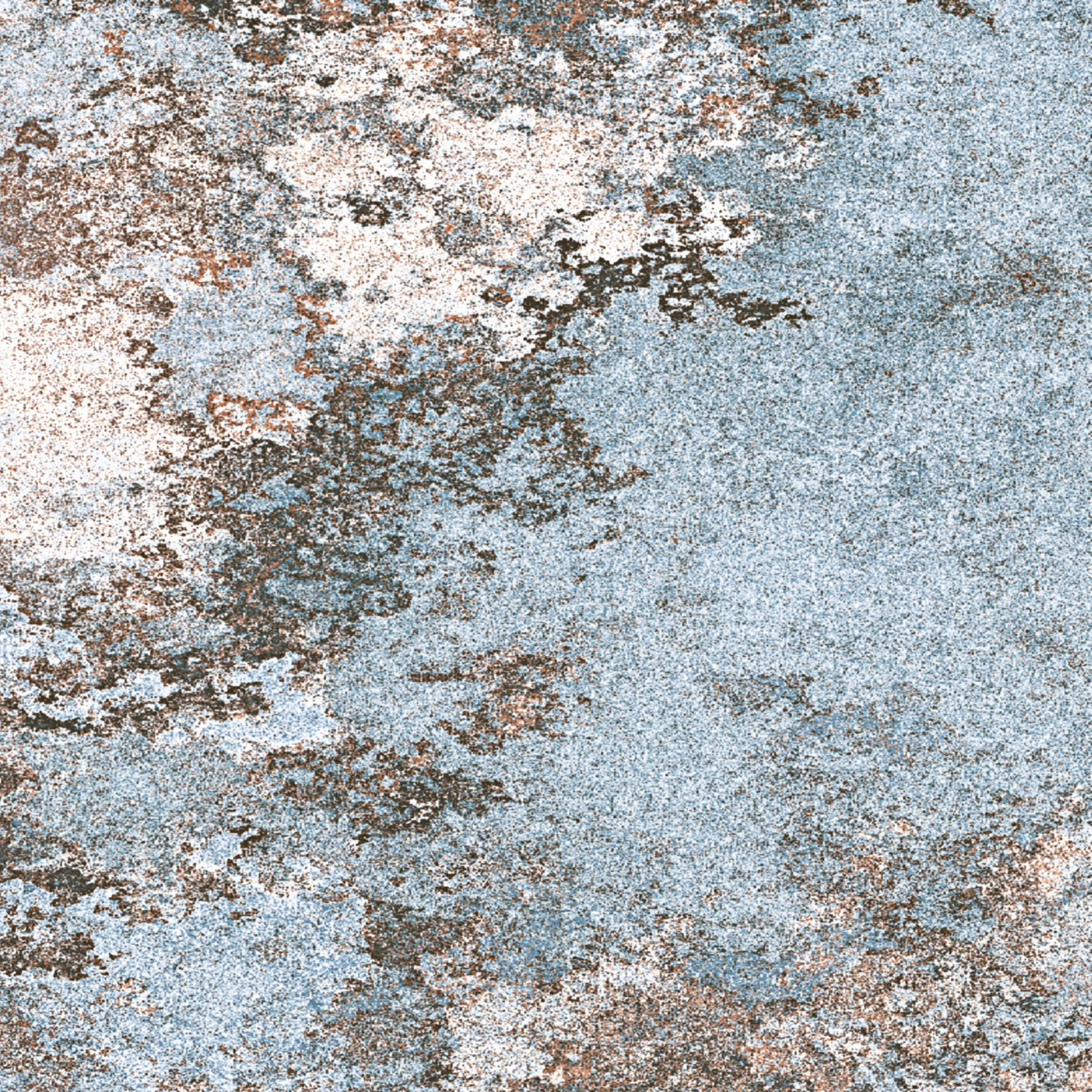 Cu un finisaj mat și textură antiderapantă (DOTS), această placă reproduce fidel aspectul unei suprafețe naturale erodate, cu nuanțe de albastru deschis, maro ruginiu și accente gri-pietros.