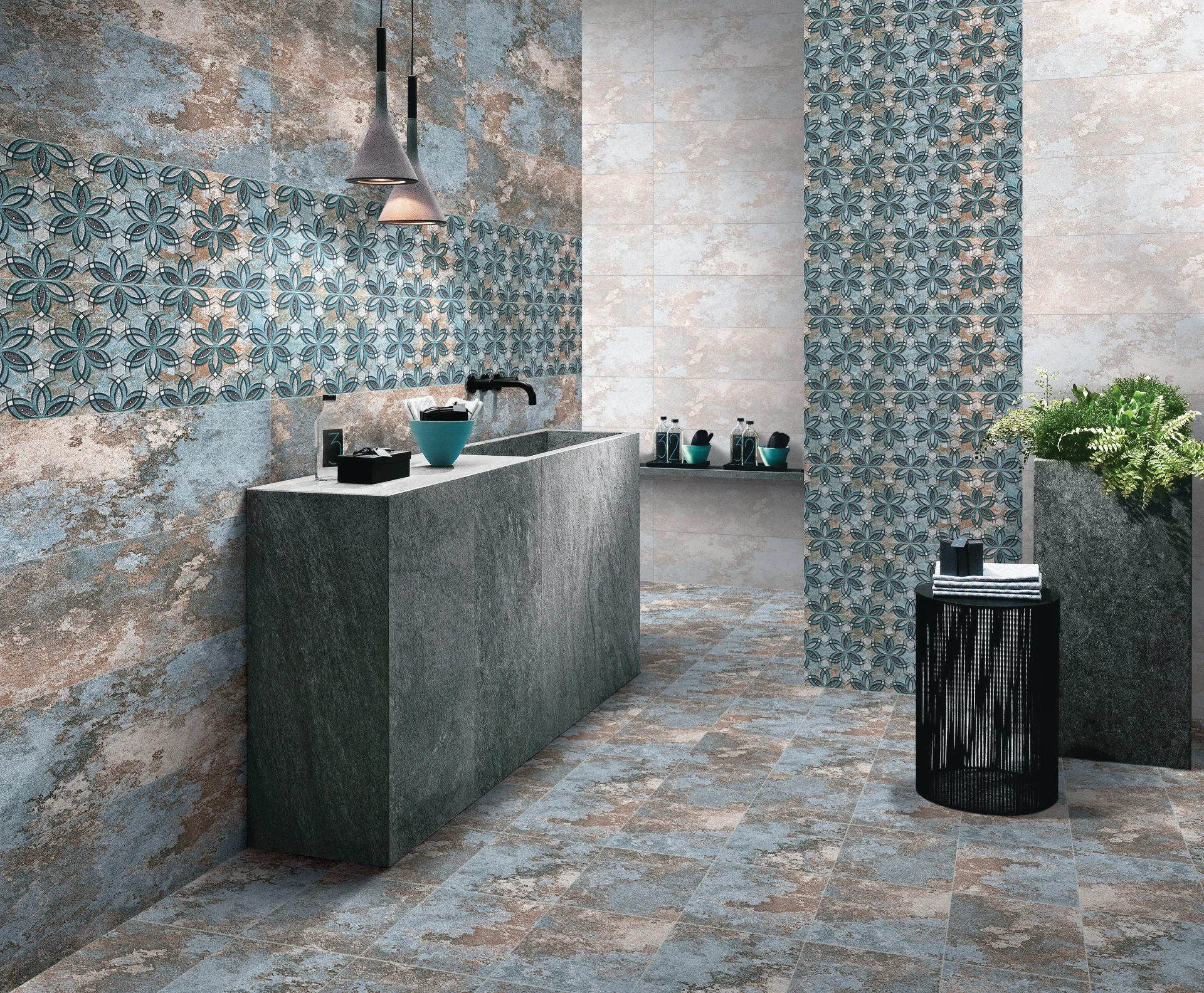 GRESIE HYDRA LIFE AC-13234 F - 30X30 cm, ceramica glazurată, rectificata, suprafata mată, cu efect antialunecare și design rustic-industrial în nuanțe de albastru, ruginiu și gri.