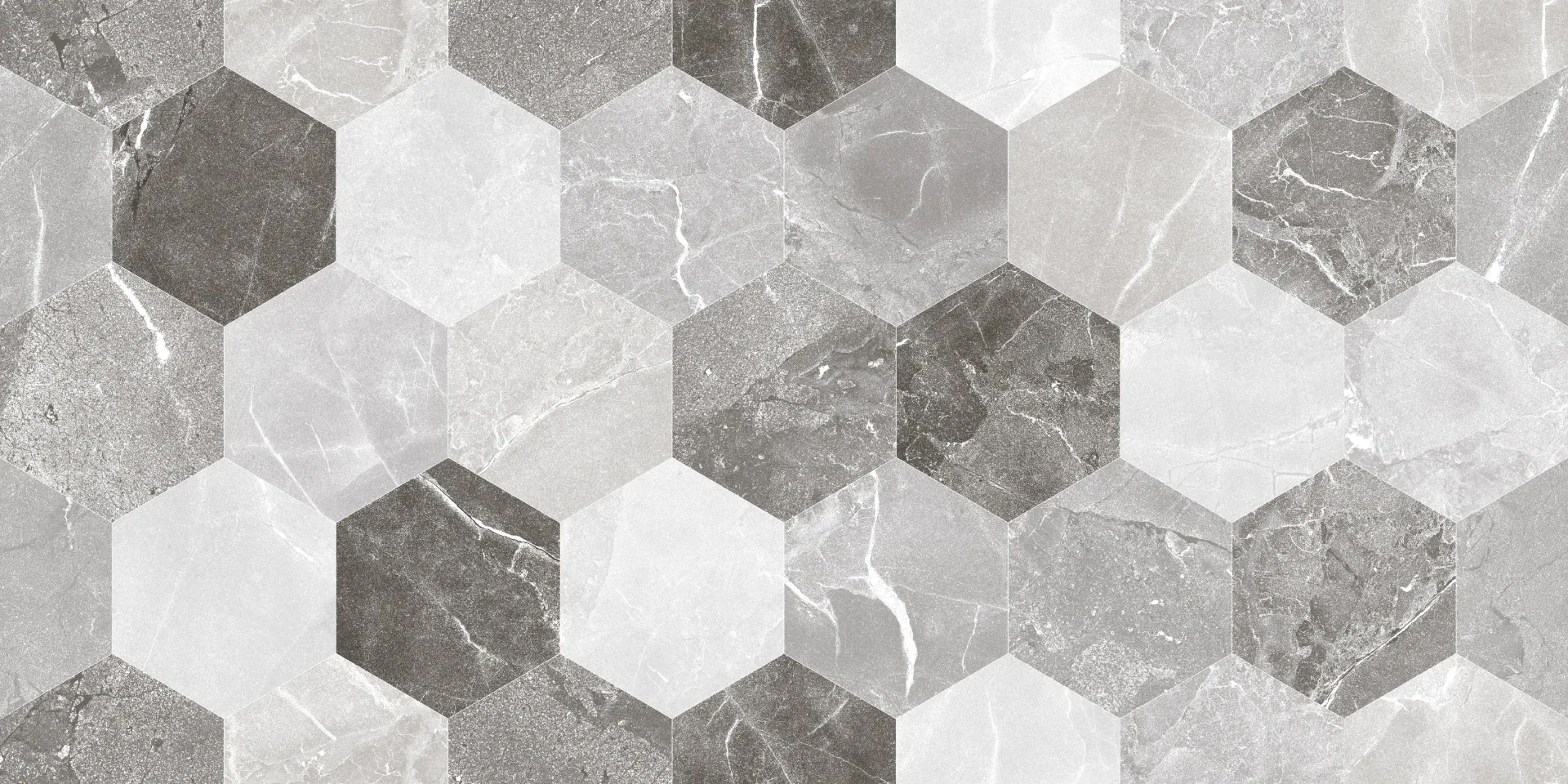 FAIANTA CLEVER GREY 15276-HL2 - 30X60 cm, ceramica glazurata, rectificata, aduce un plus de dinamism și modernitate oricărui spațiu interior, prin modelul său hexagonal în nuanțe de gri și finisajul lucios elegant.