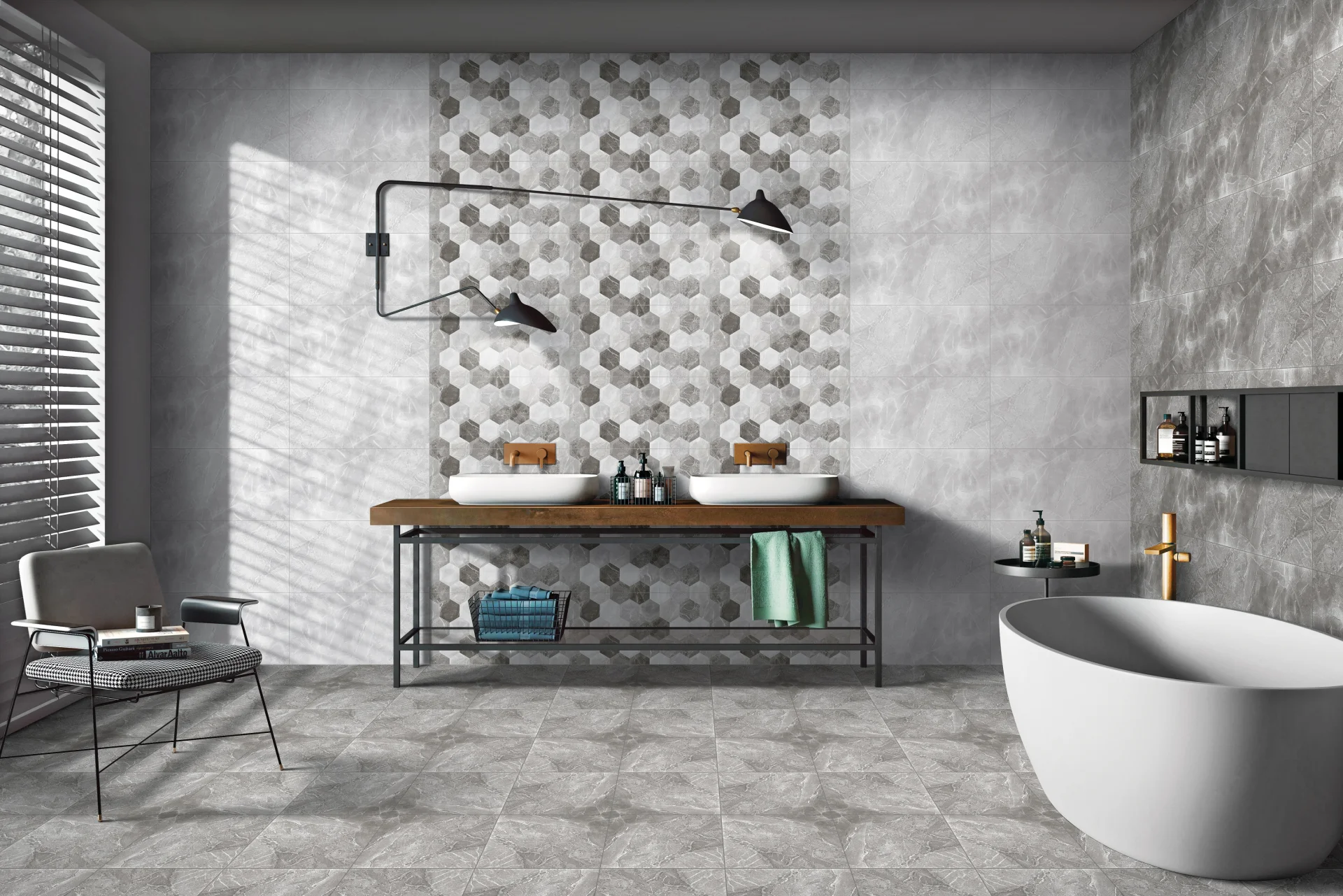 Se poate combina armonios cu faianțele decorative din aceeași colecție, precum Clever Grey 15276-HL2.