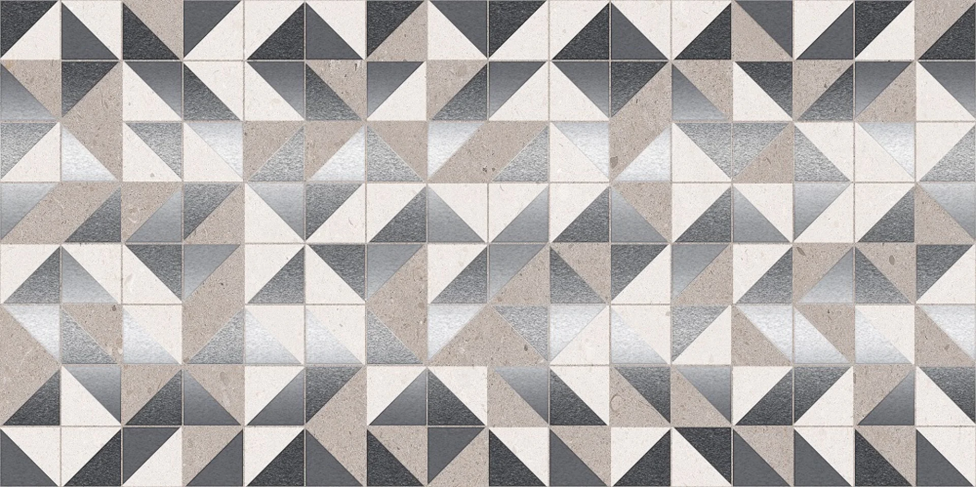 Faianța 32344-METALLIC GIN impresionează printr-un design geometric complex în tonuri neutre de gri și bej, completat de accente metalice discrete ce oferă un efect vizual sofisticat.