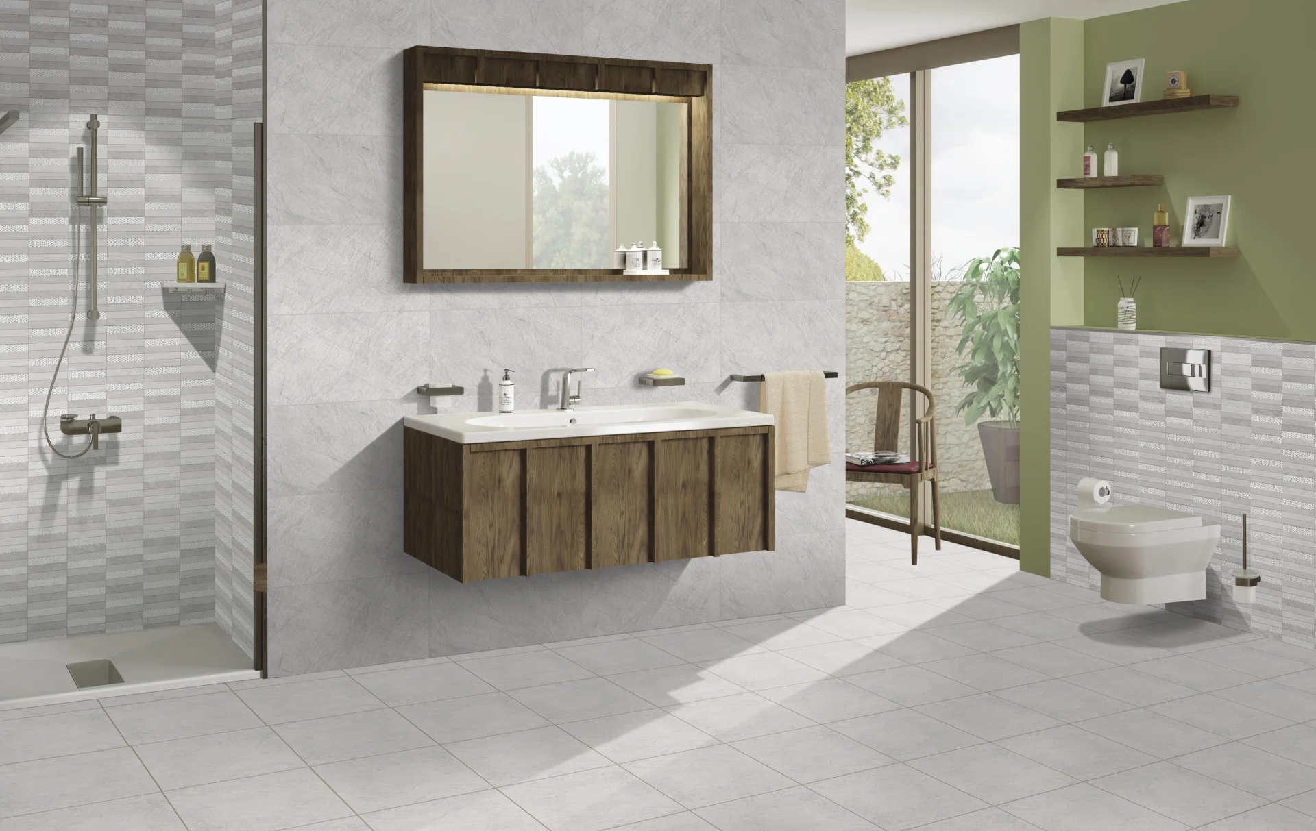 Această placă glazurată, rectificată și cu dimensiuni generoase oferă o estetică modernă, ideală pentru amenajarea pereților interiori.