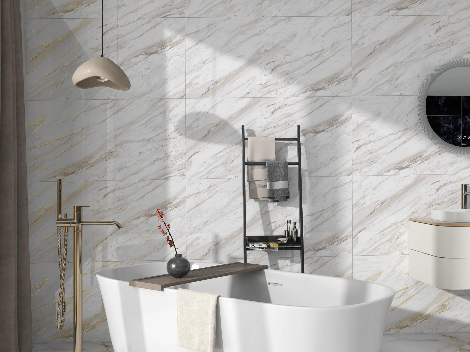 PORTELANATA, GLAZURATA, RECTIFICATA, INTERIOR/EXTERIOR, FINISAJ LUCIOS CU EFECT GOLD CARVING, ALB RANDOM 3, PEI III, RATA DE ABSORBTIE A APEI 0.03%, COMPATIBILA CU SISTEME DE INCALZIRE IN PARDOSEALA, RECOMANDATA PENTRU PLACARE PARDOSEALA SI PERETI
