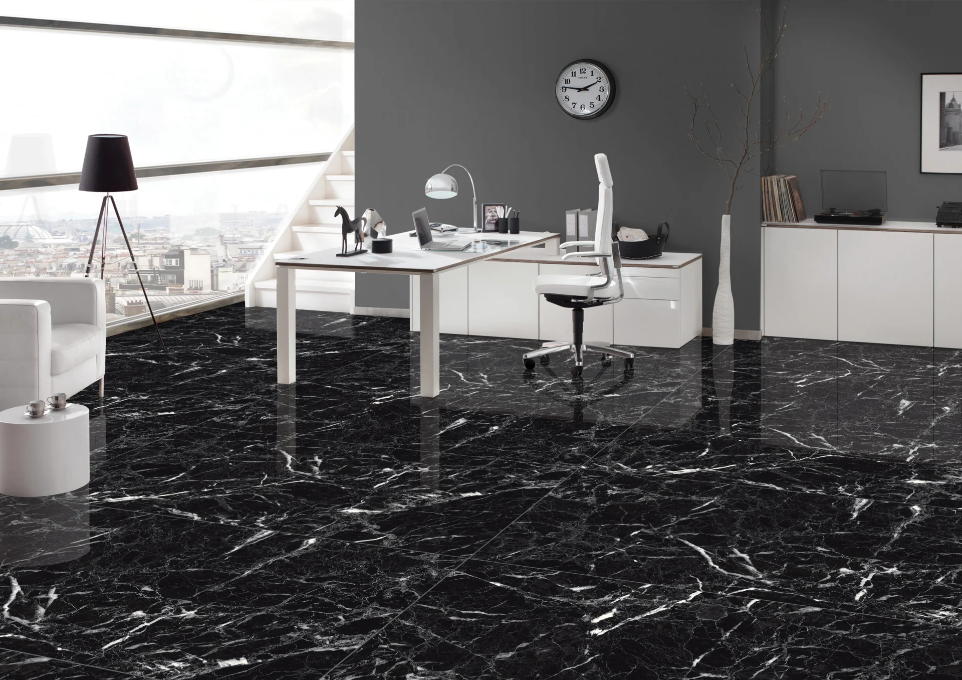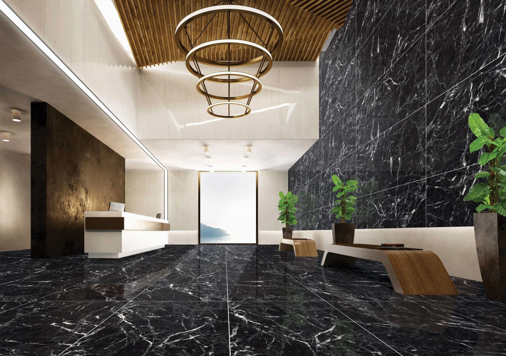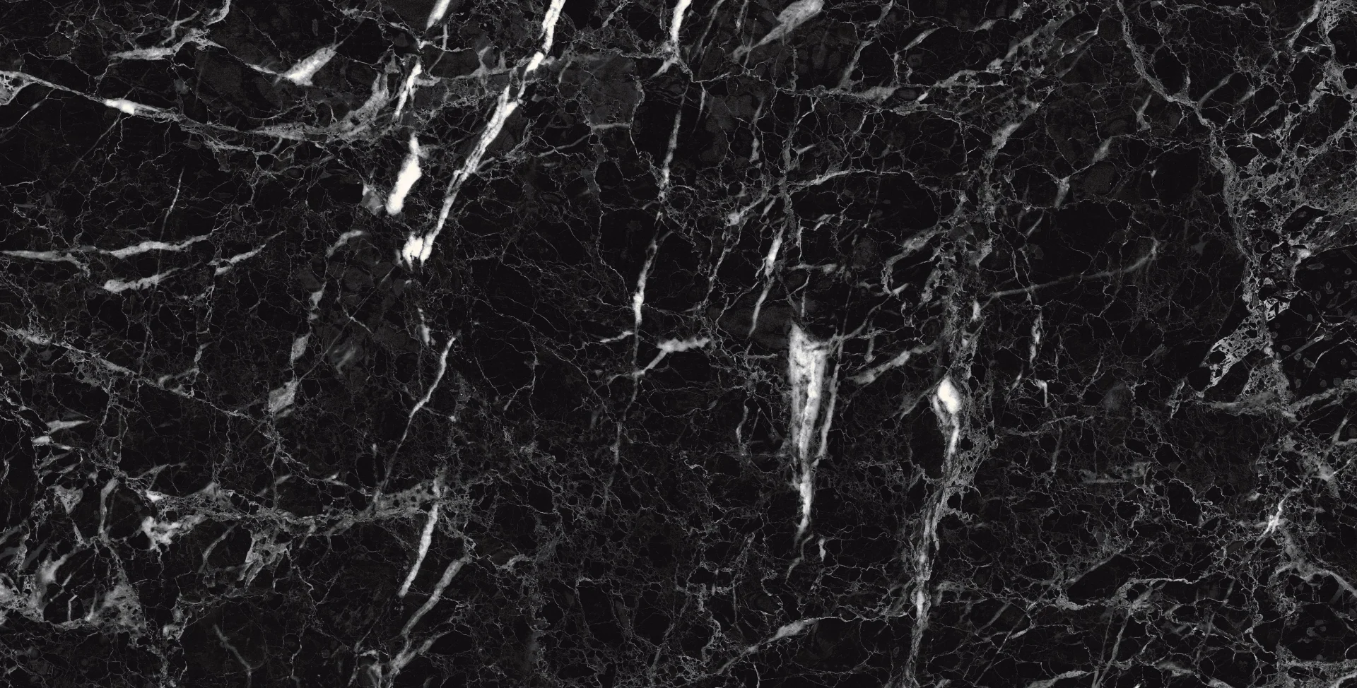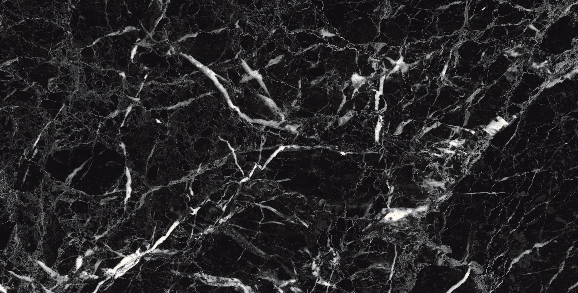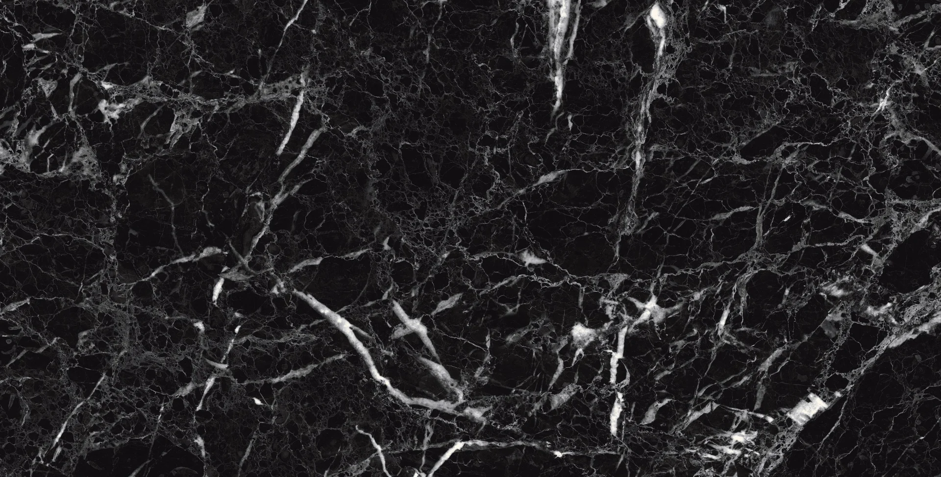 GRESIE NEW HG BLACK EMPERADOR - 60X120 cm, porțelanată, super lucioasă high glossy, aspect de marmura negru intens cu nervuri albe, recomandată pentru interioare elegante.