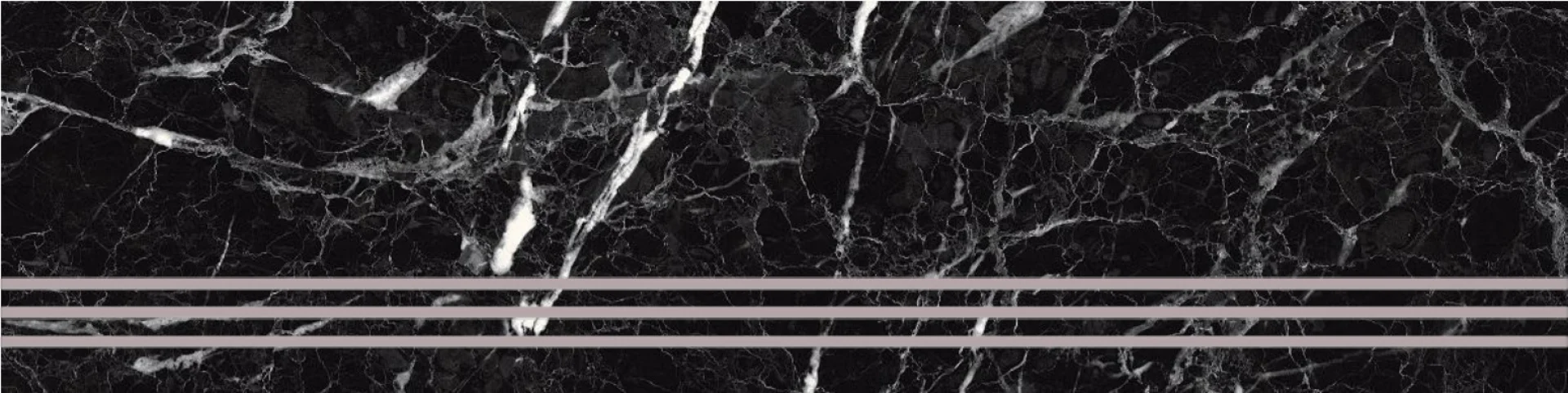 TREAPTA GRESIE NEW HG BLACK EMPERADOR - 30X120 cm, portelanata, glazurata, rectificata, în nuanțe intense de negru cu vene albe și gri, finisaj lucios high-gloss, ideală pentru scări interioare elegante.