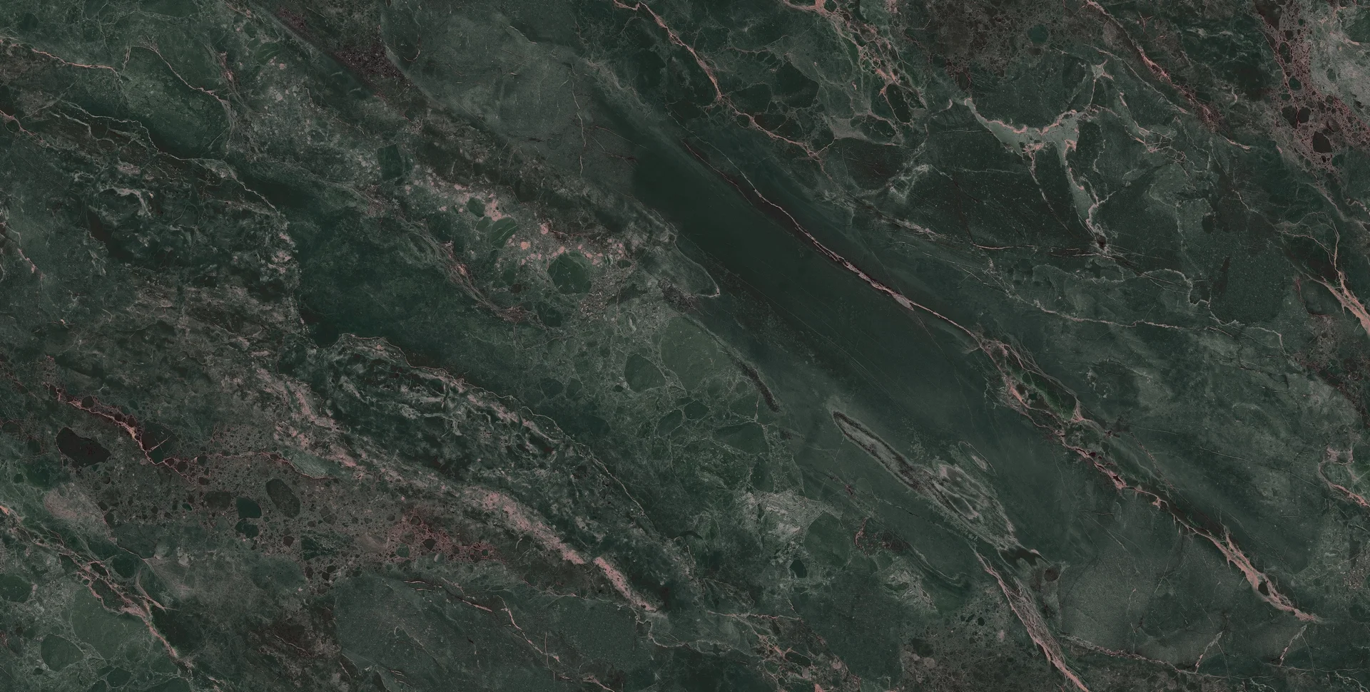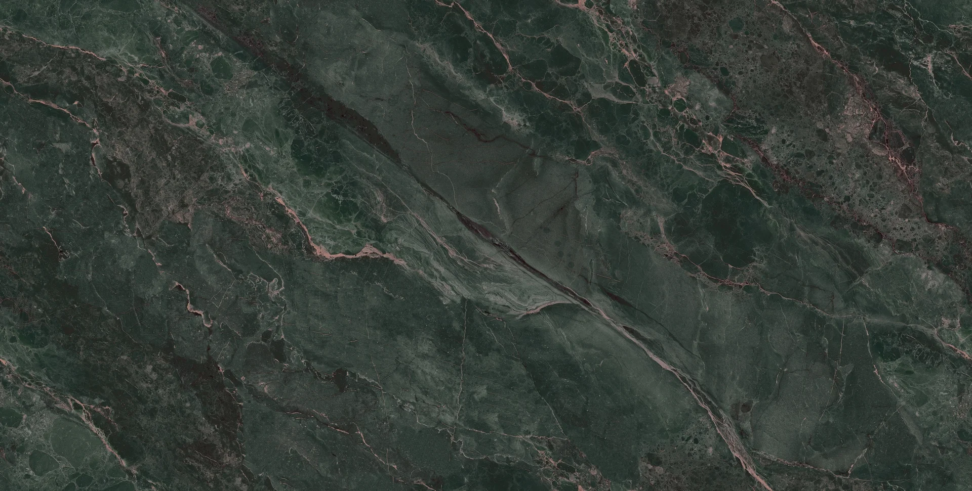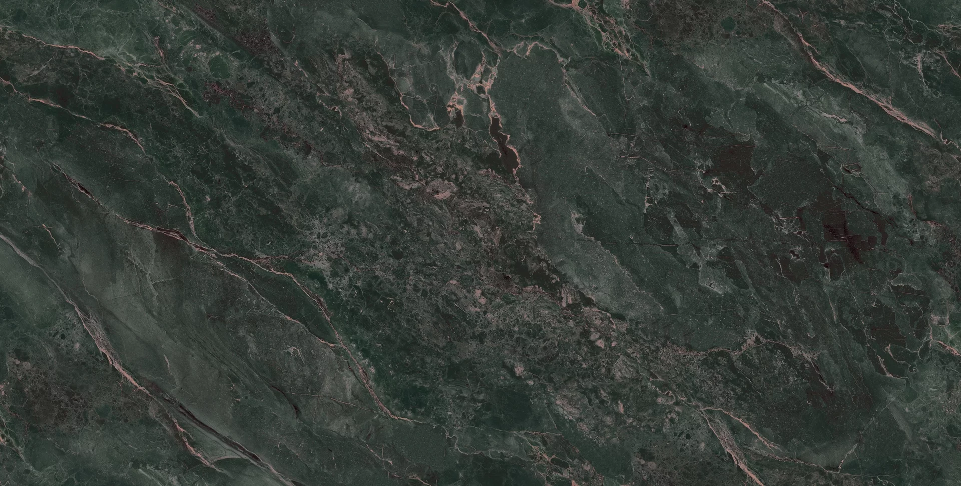 GRESIE RHYOLITE FOREST - 80X160 cm, porțelanată, aspect de marmură exotică verde cu vene fine rozalii și gri, finisaj super lucios high glossy, ideală pentru interioare luxoase și moderne.