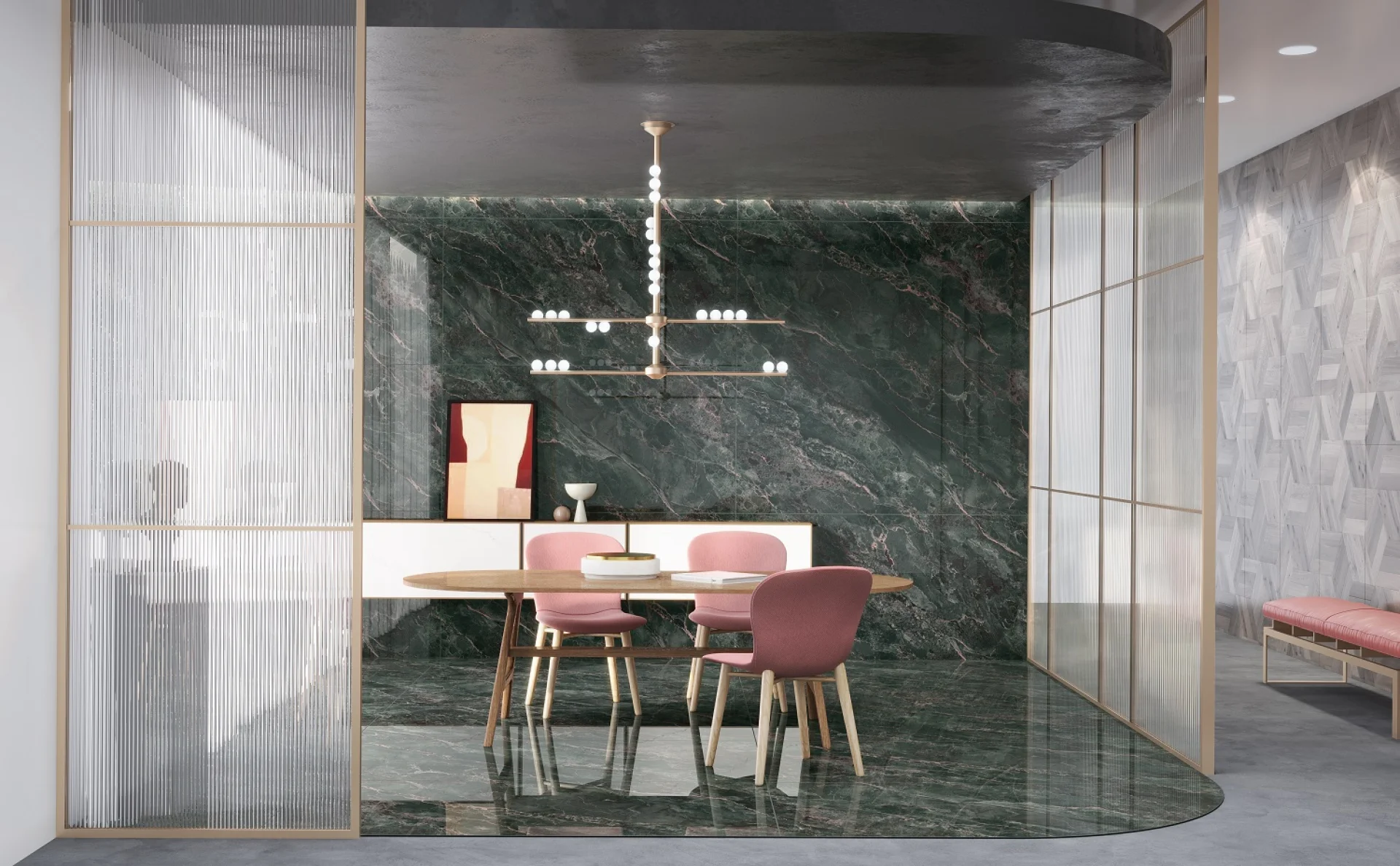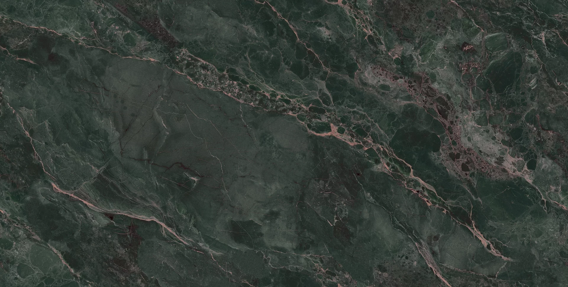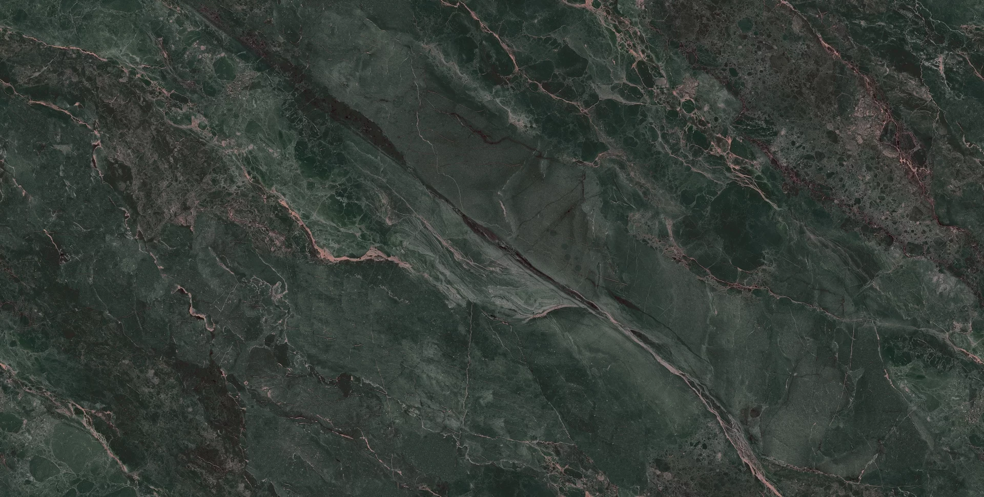 GRESIE RHYOLITE FOREST - 80X160 cm, porțelanată, aspect de marmură exotică verde cu vene fine rozalii și gri, finisaj super lucios high glossy, ideală pentru interioare luxoase și moderne.