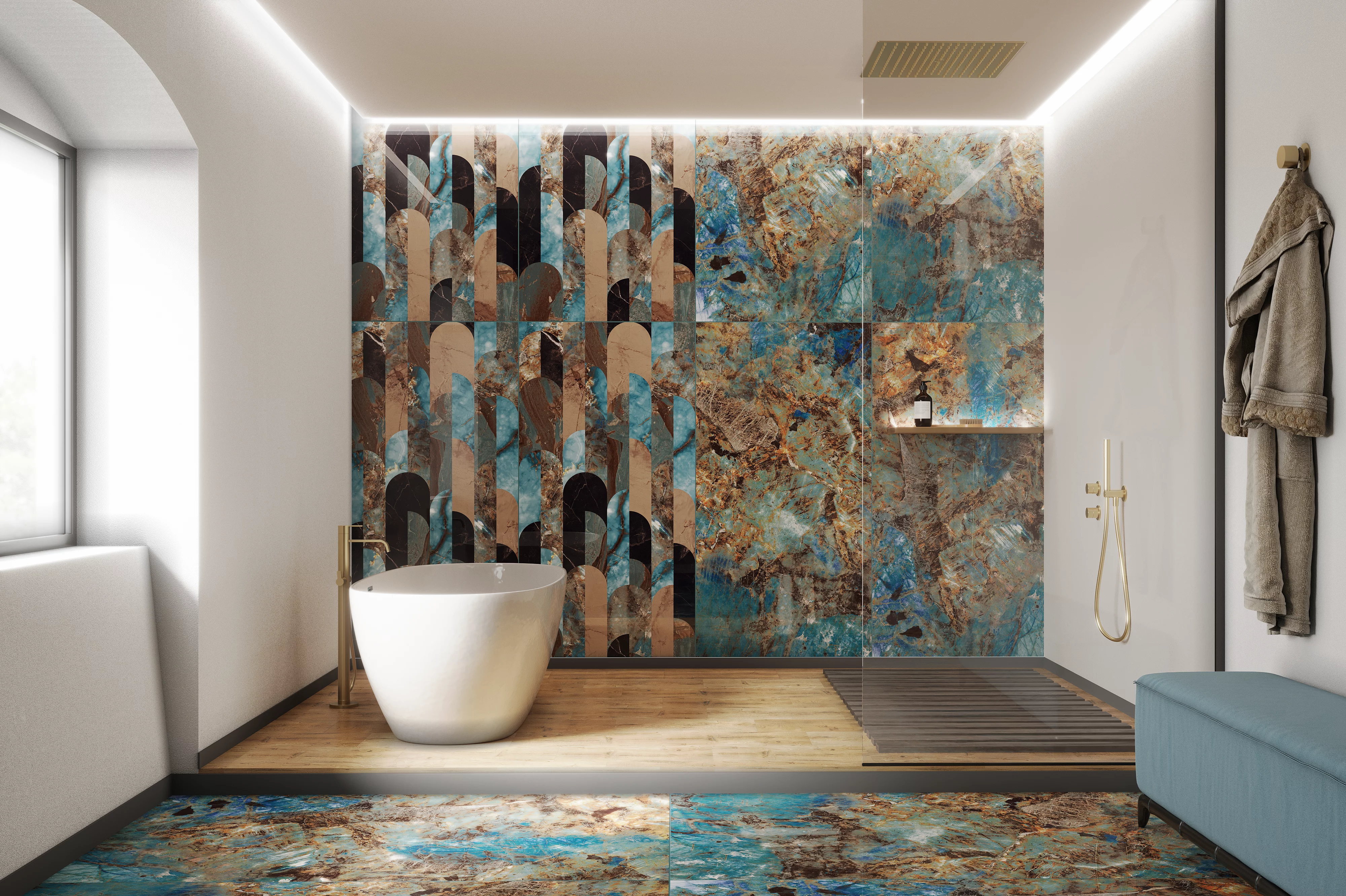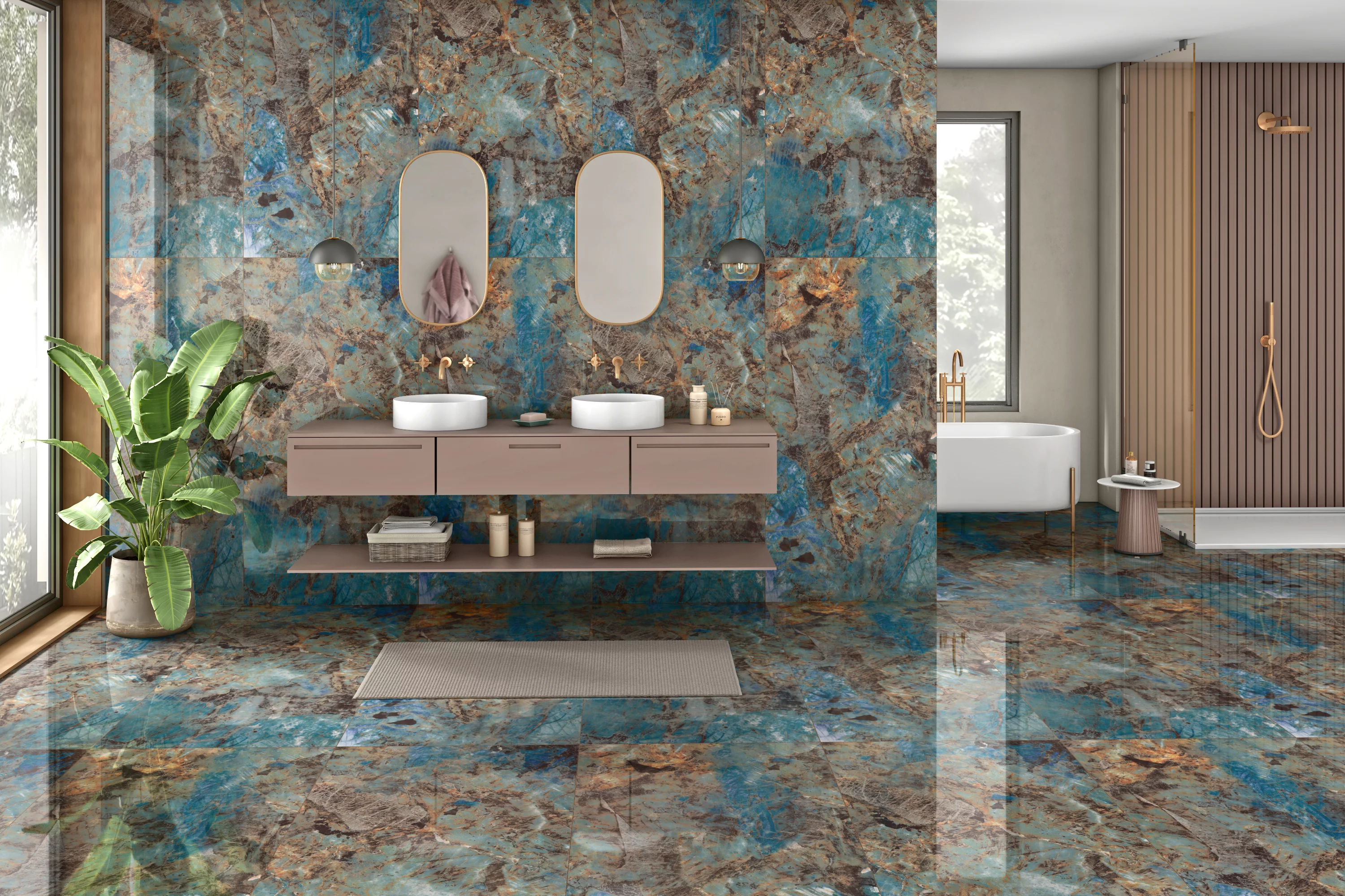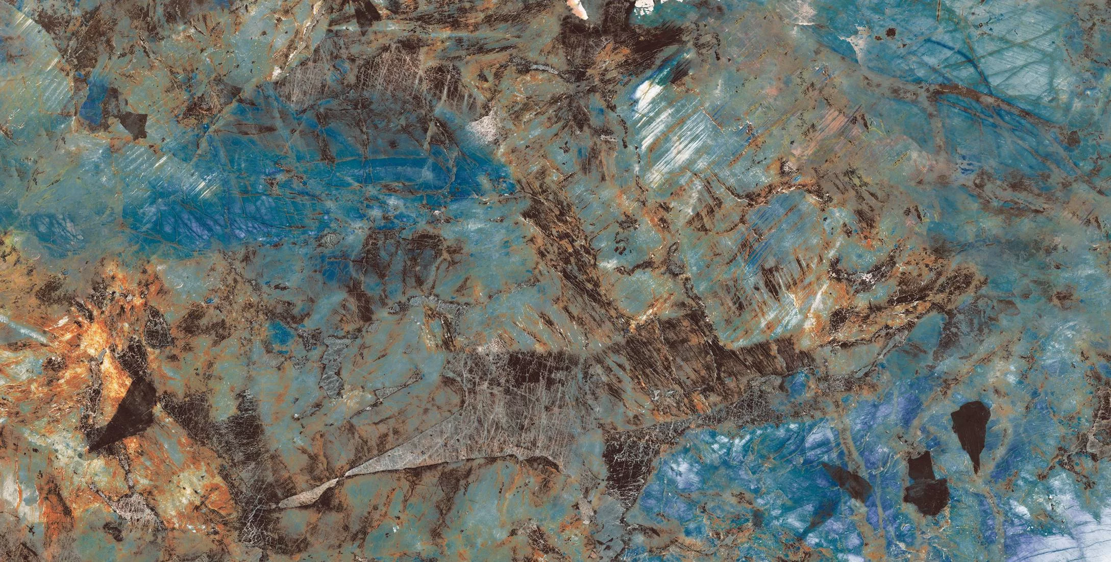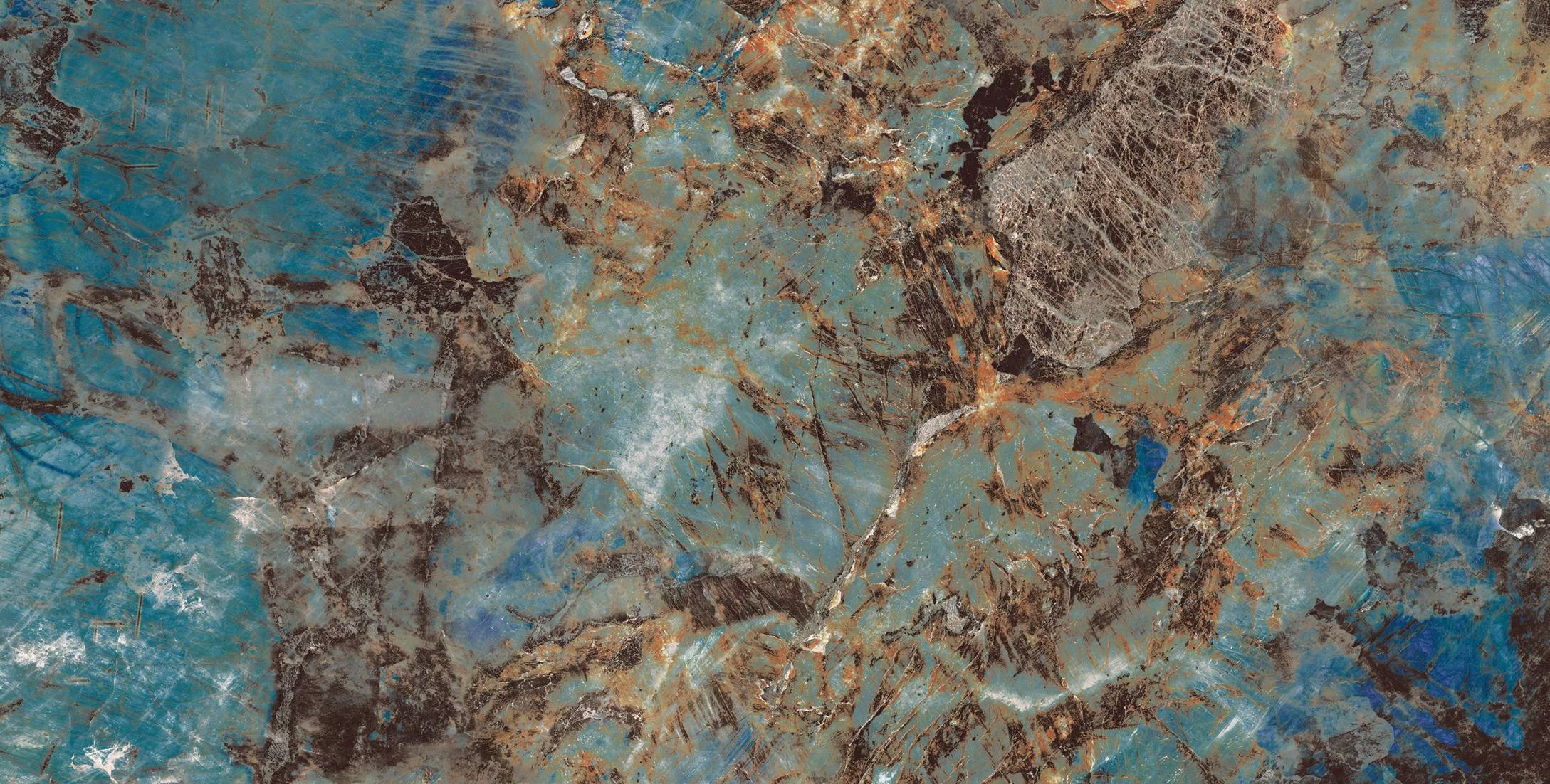 GRESIE REAL CASTOR - 80X160 cm, porțelanată, atrage prin finisajul său super lucios High Glossy și designul spectaculos, cu tonuri vibrante de albastru, turcoaz și accente ruginii, pentru interioare pline de personalitate.