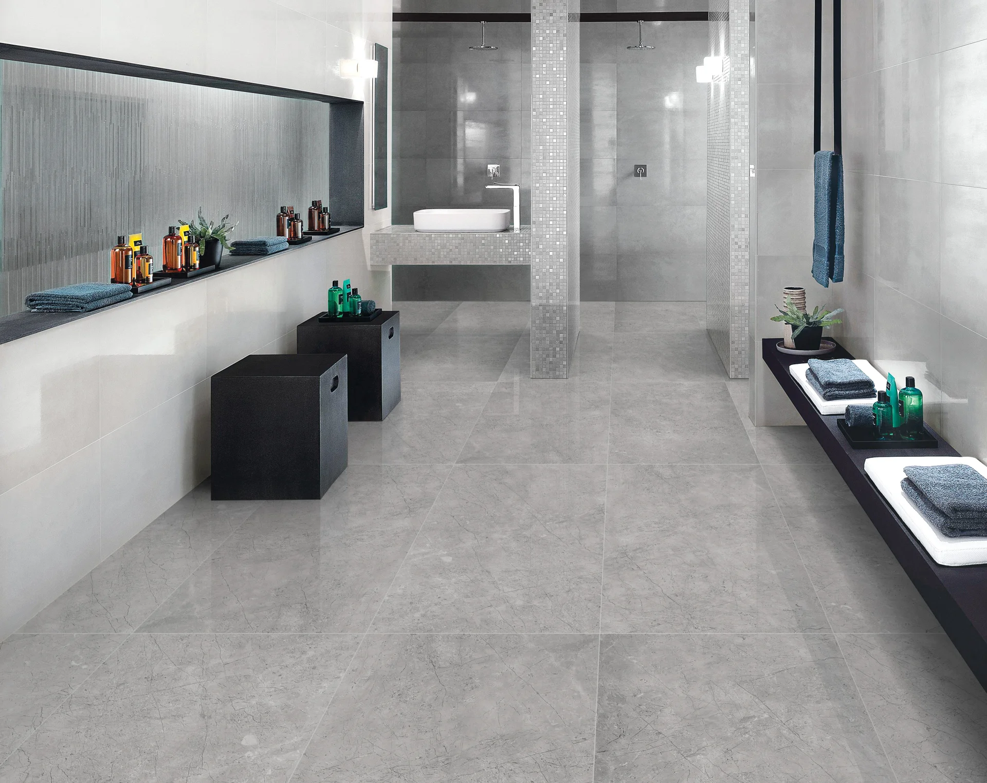 Plăcile de mari dimensiuni, 80x160 cm, rectificate, permit un montaj cu rosturi minime, generând o suprafață continuă, cu impact vizual deosebit.