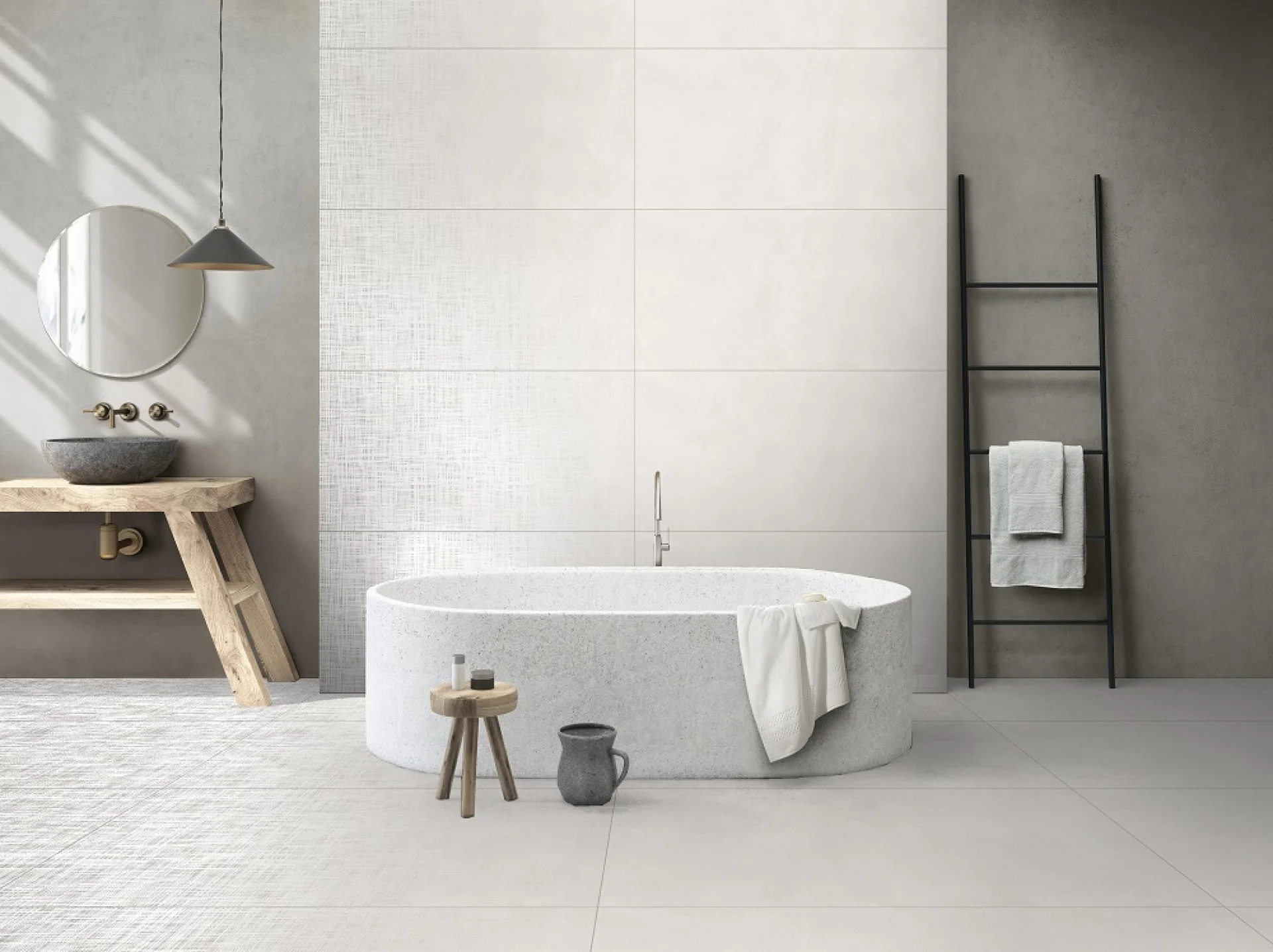 Gresia FABRIC 2 WHITE se evidențiază prin aspectul său monocrom, curat și uniform, ce imită o suprafață textilă delicată cu o textura discretă în relief.