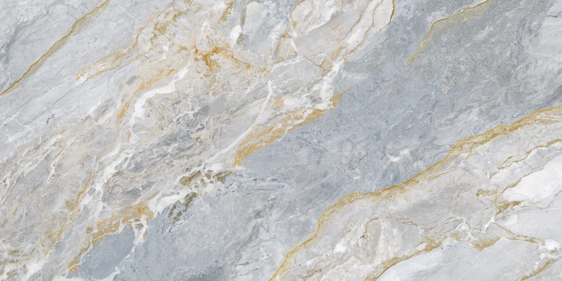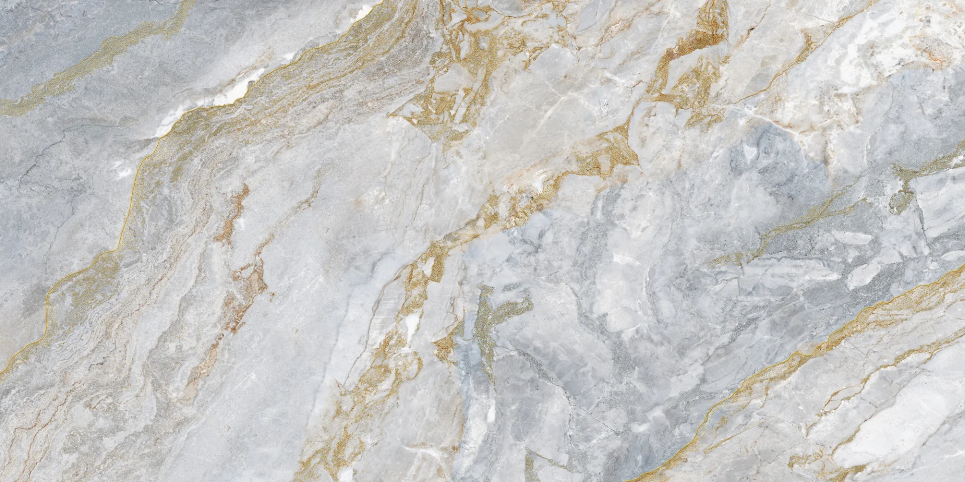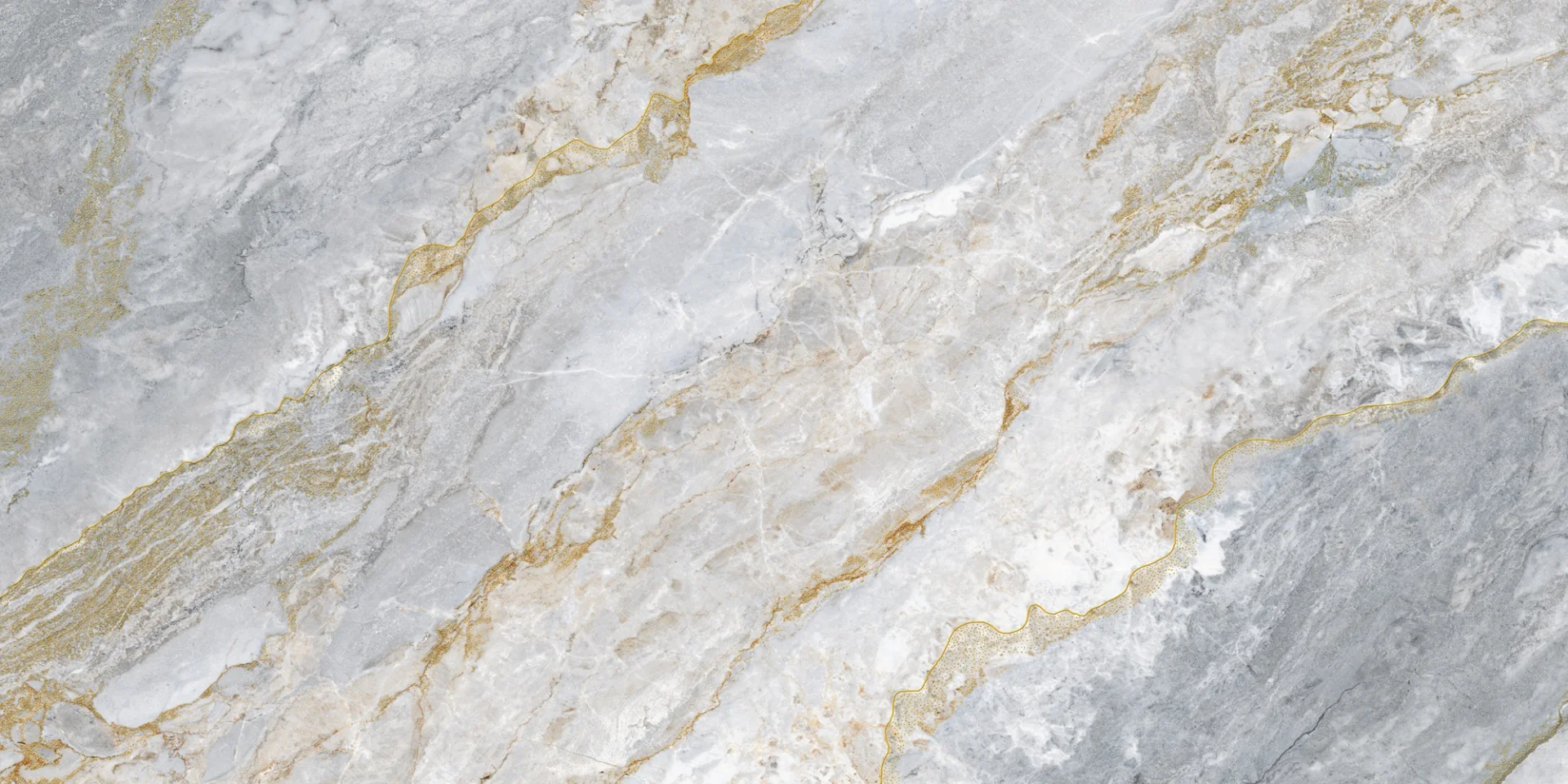 GRESIE GOLDEN PIRANA 1016 - 60X120 cm, porțelanată, lucioasă, cu efect gold carving, în tonuri de gri cu inserții aurii, potrivită pentru interioare și exterioare elegante.