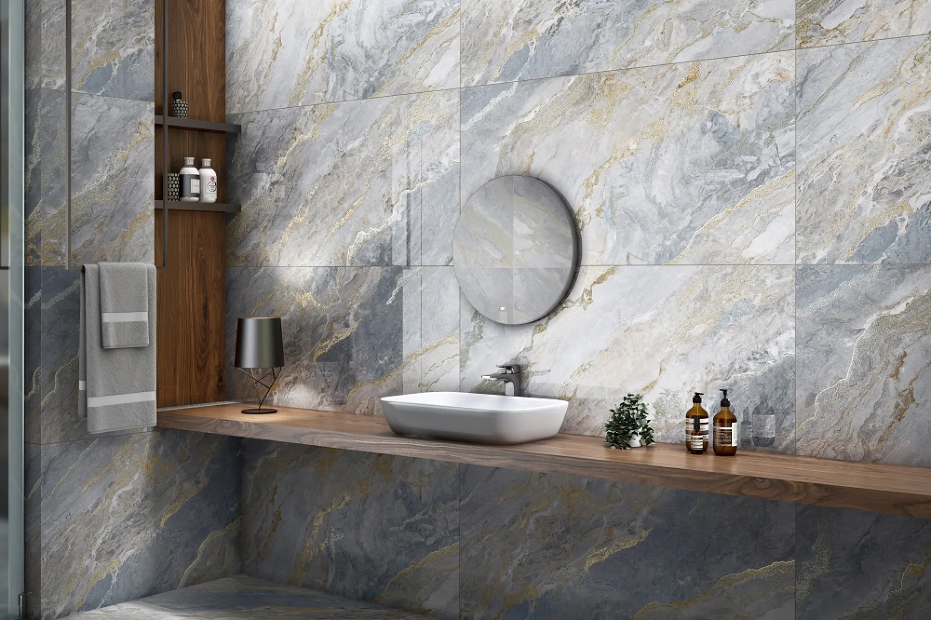 Finisajul lucios cu efect gold carving evidențiază venele aurii și contrastele cromatice, sporind luminozitatea spațiilor și adăugând o notă premium.
