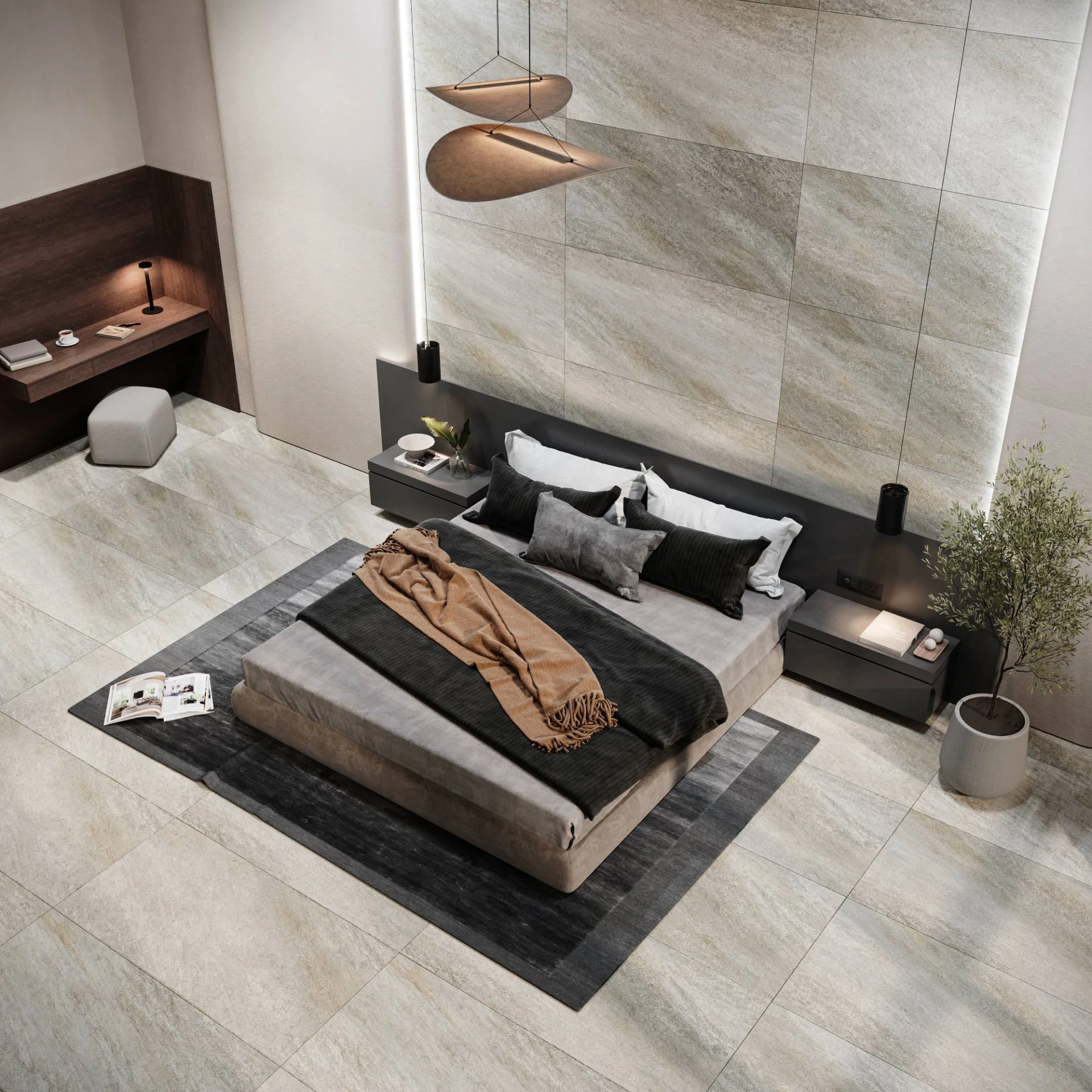 Tonurile discrete de gri, combinate cu texturi minerale și un finisaj structurat cu granula, creează un efect vizual autentic, ideal pentru interioare contemporane sau zone exterioare elegante.