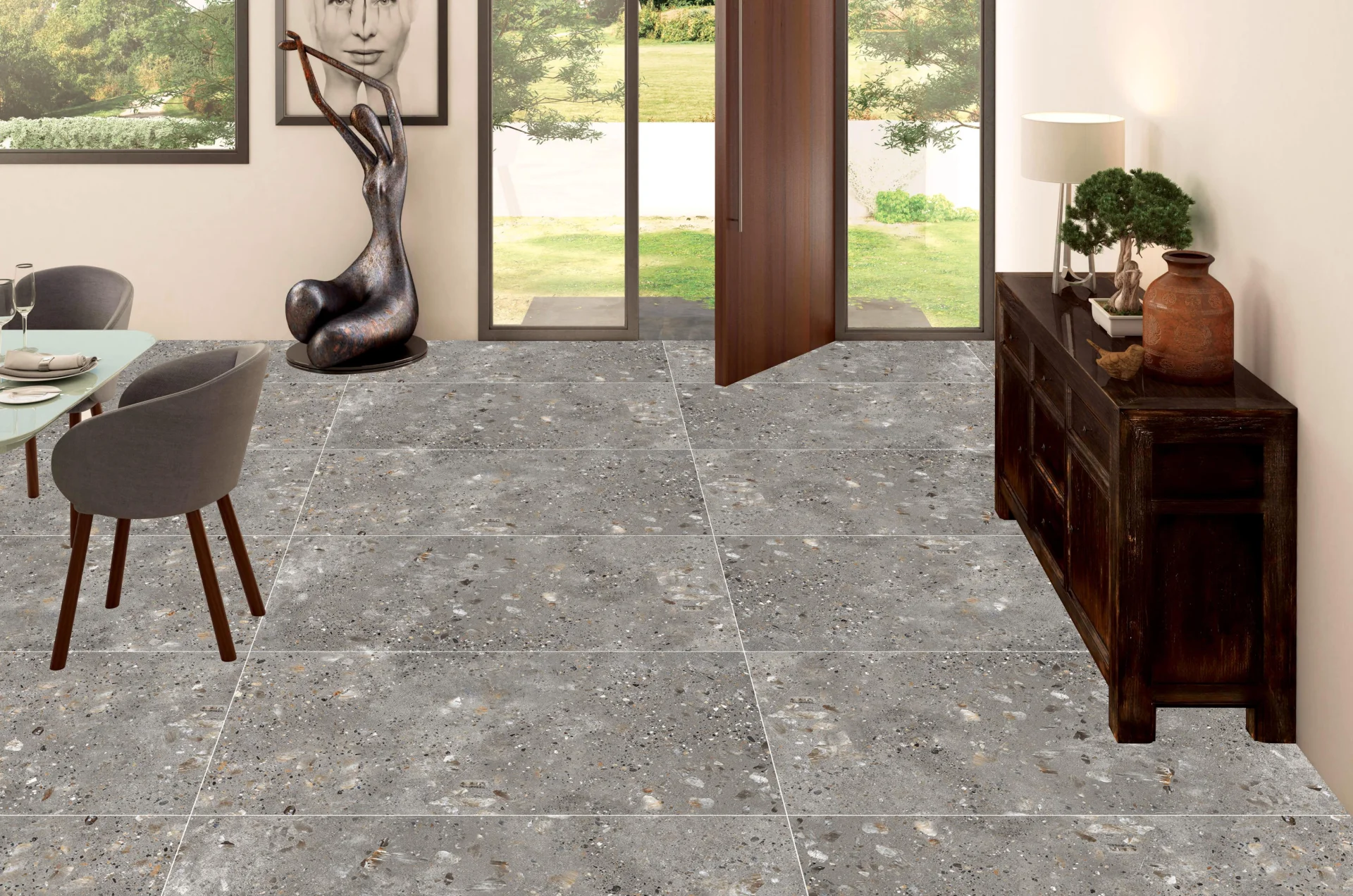 Inspirată de stilul Terrazzo, această gresie oferă o textură vibrantă și detalii elegante în nuanțe de gri, potrivindu-se perfect atât în interioare sofisticate, cât și în spații comerciale sau exterioare acoperite.