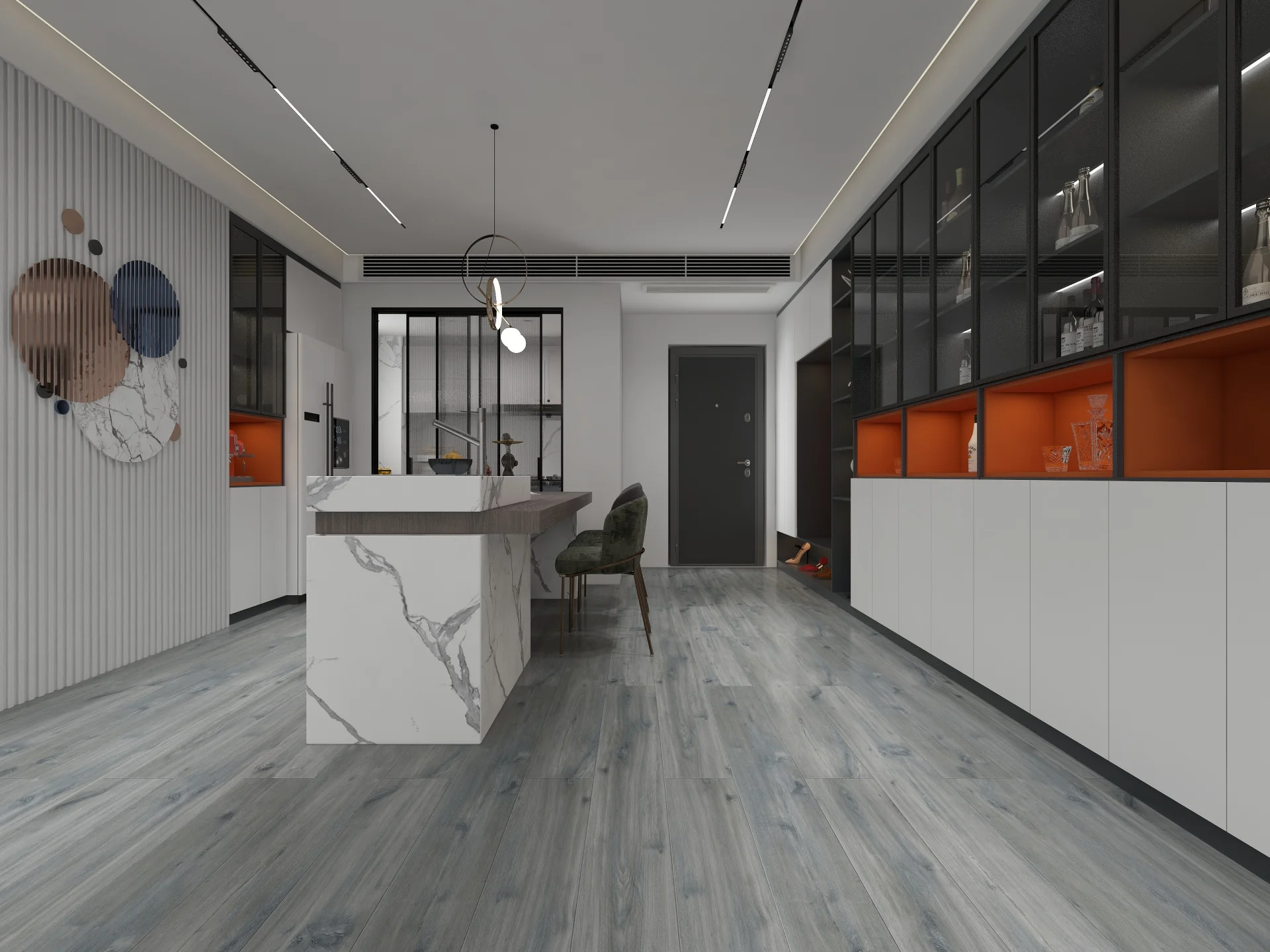 Parchetul mineral SPC Artemis OR1005 oferă o estetică sofisticată prin nuanțele sale intense de gri-negru, inspirate de lemnul ars sau carbonizat.