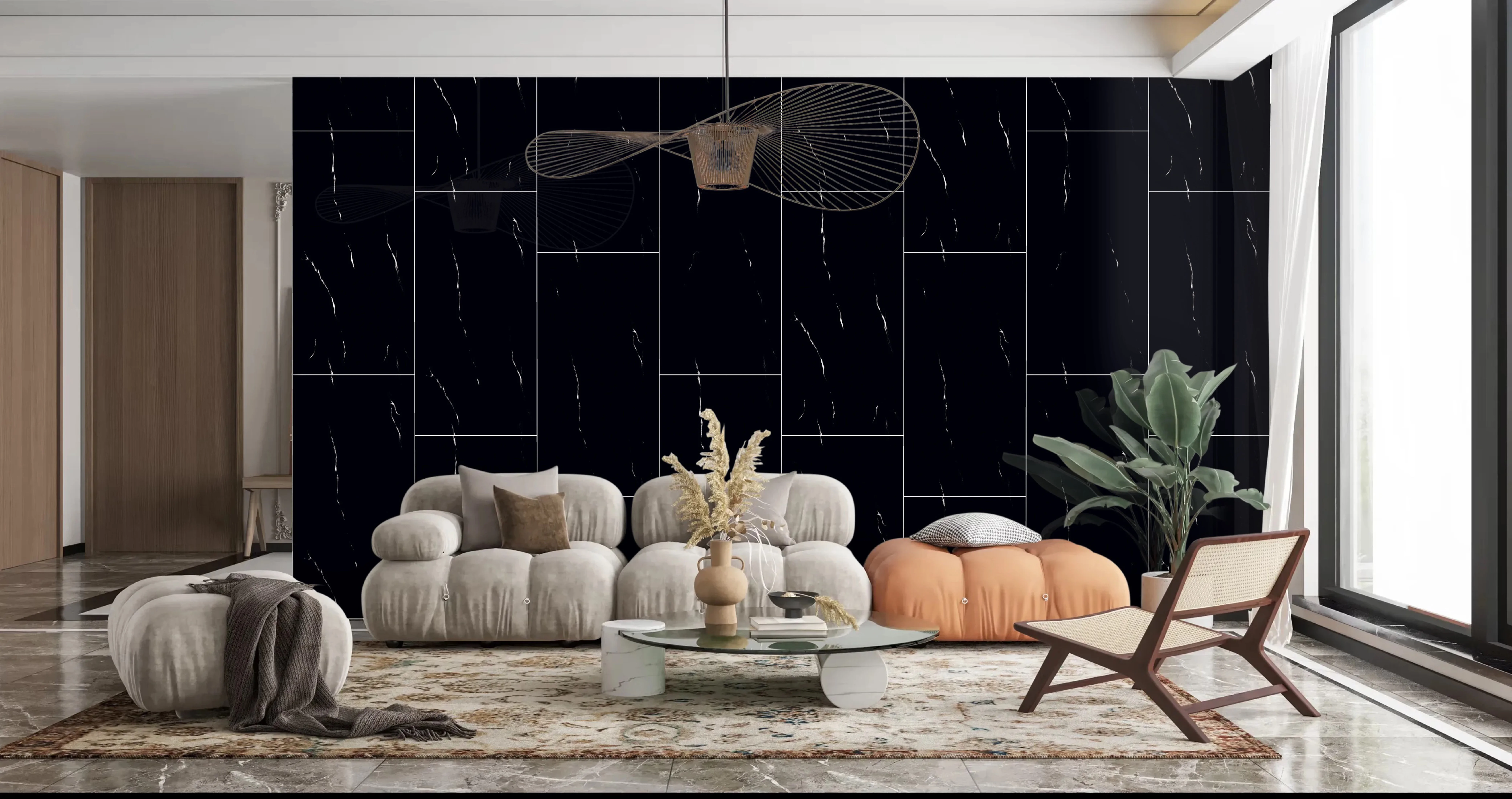 Gresie BLACK OBSIDIAN 60x120 porțelanată, super lucioasă high glossy, neagră cu accente de culoare albă, imitație piatră naturală