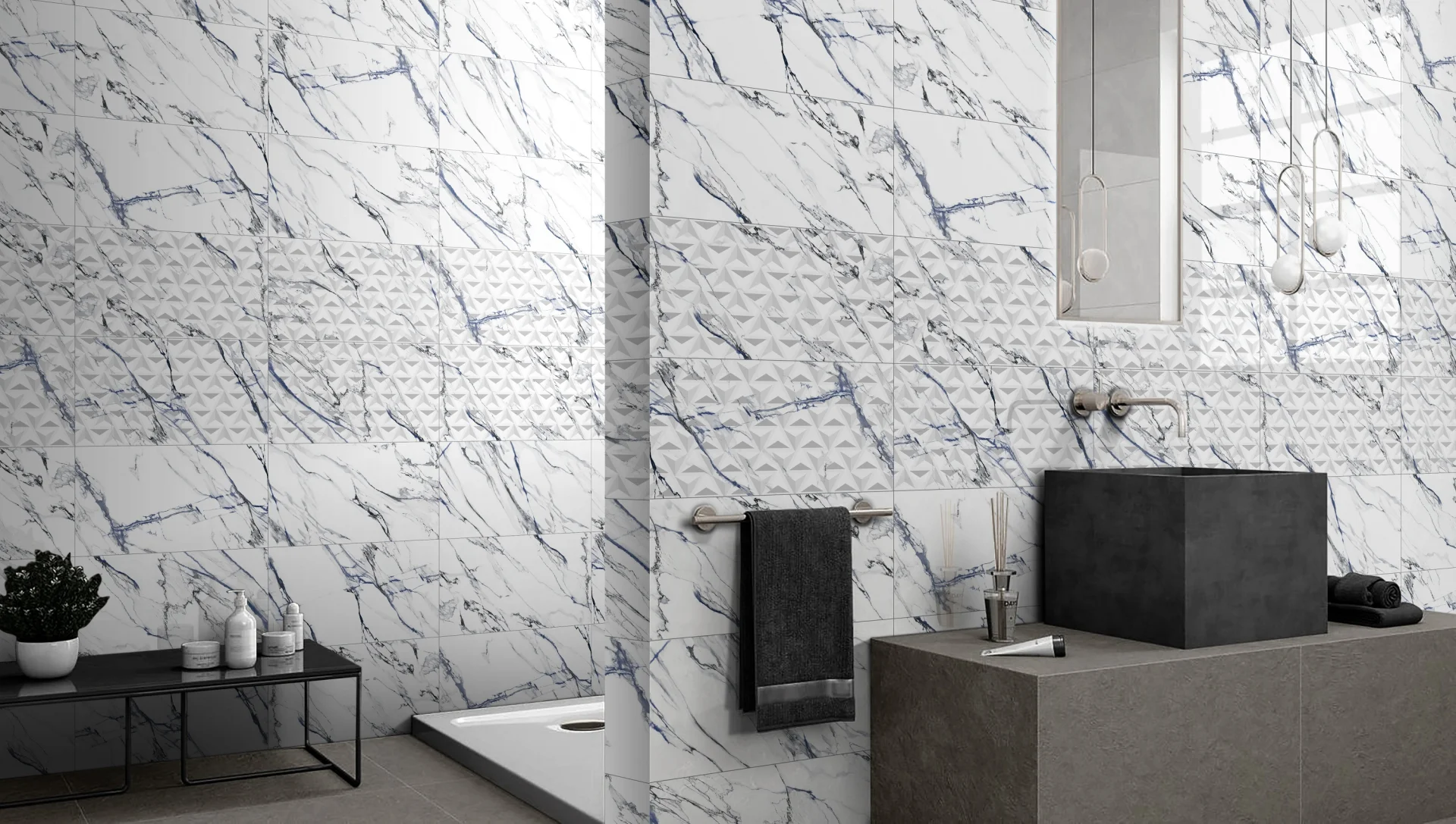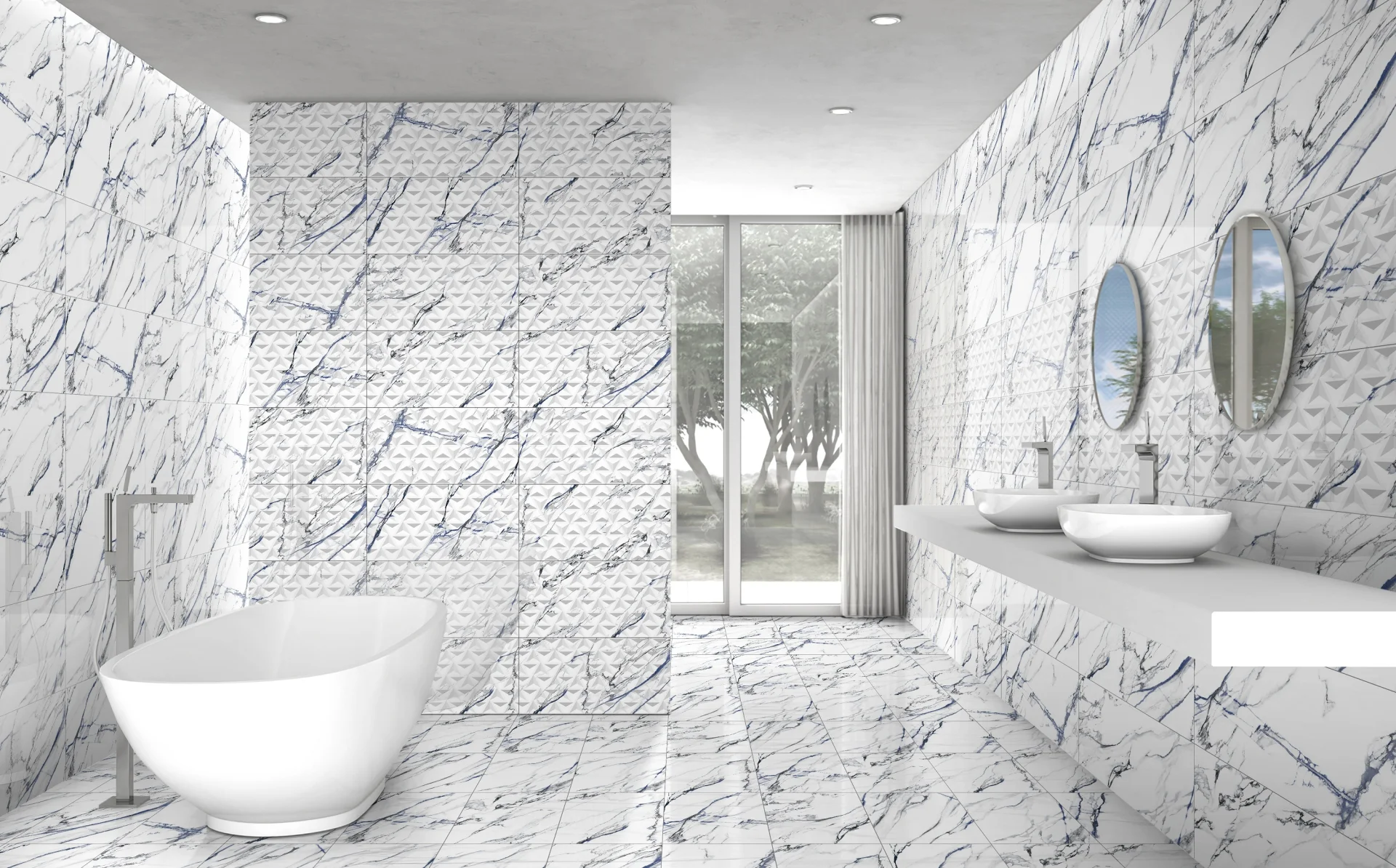 FAIANTA OIKOS BLUE DECOR - 30X60 cm, ceramica glazurată, rectificata, lucioasă, recomandata pentru interior, cu model geometric subtil in relief, pe fundal de marmură albă cu vene albastre si gri, ideală pentru accente moderne.