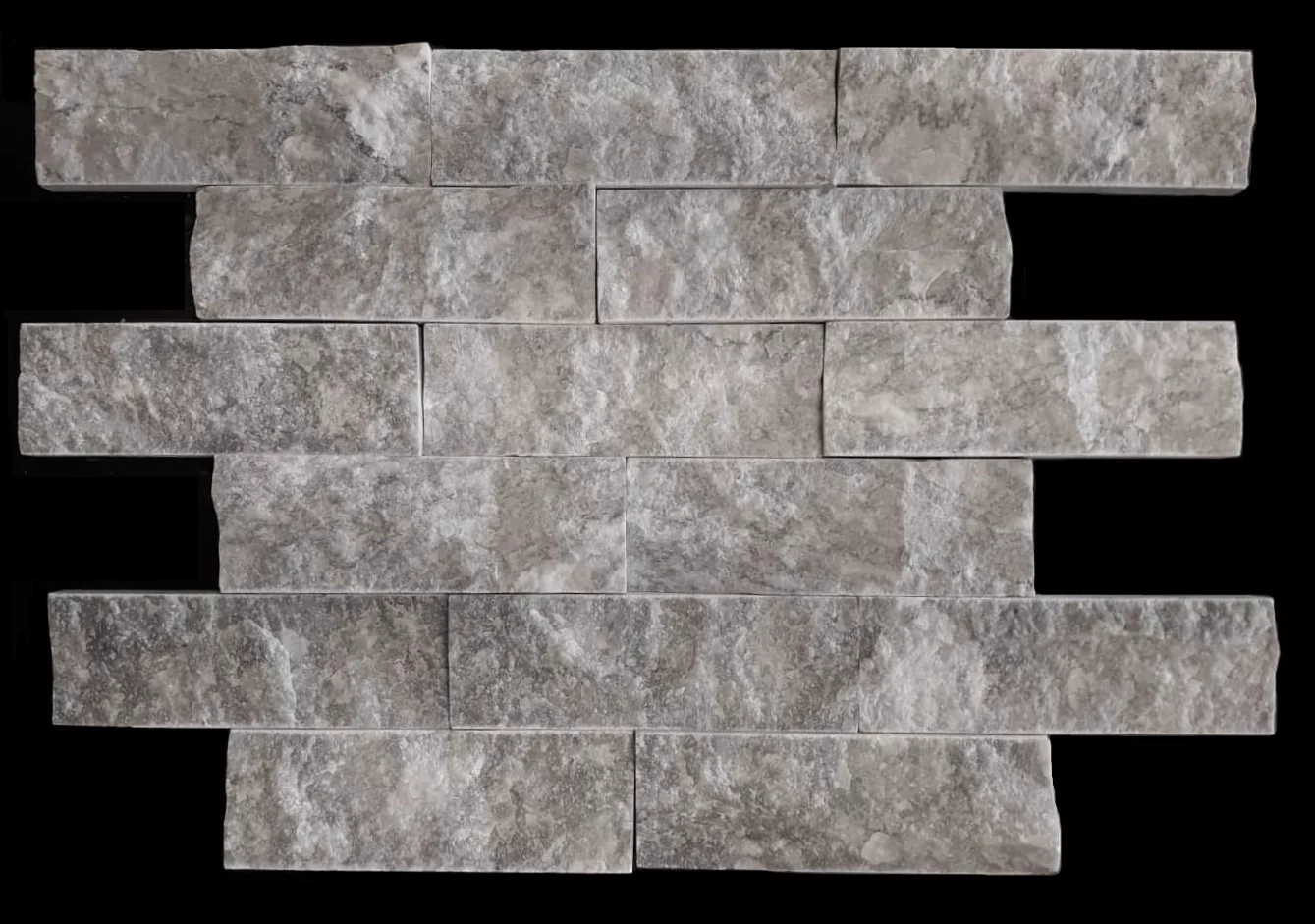 MARMURA SILVERSNAKE - 5X15 cm, grosime variabilă 1.5-1.8 cm, finisaj scapitat, nuanțe reci de gri, argintiu și grafit, ideal pentru placări interioare sau exterioare cu efect de piatră brută.