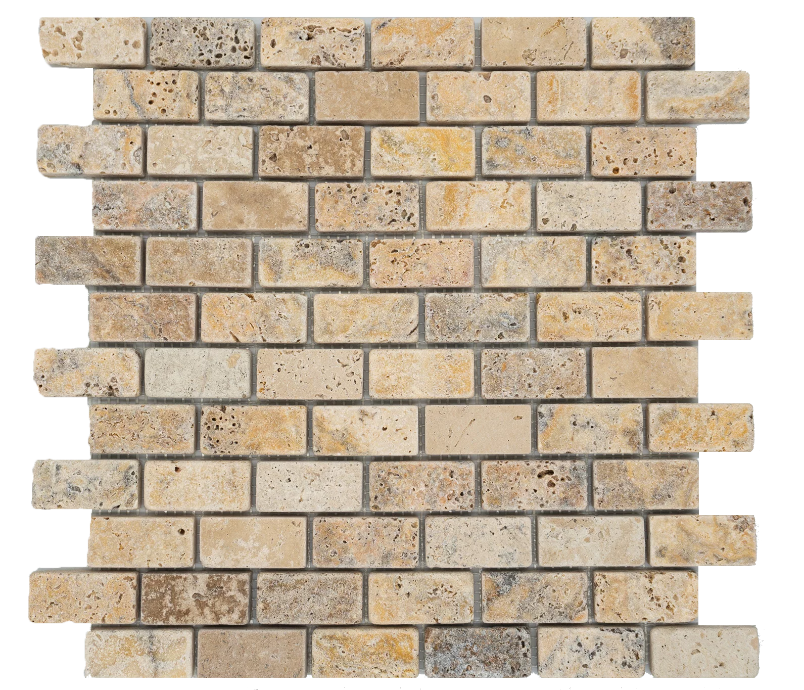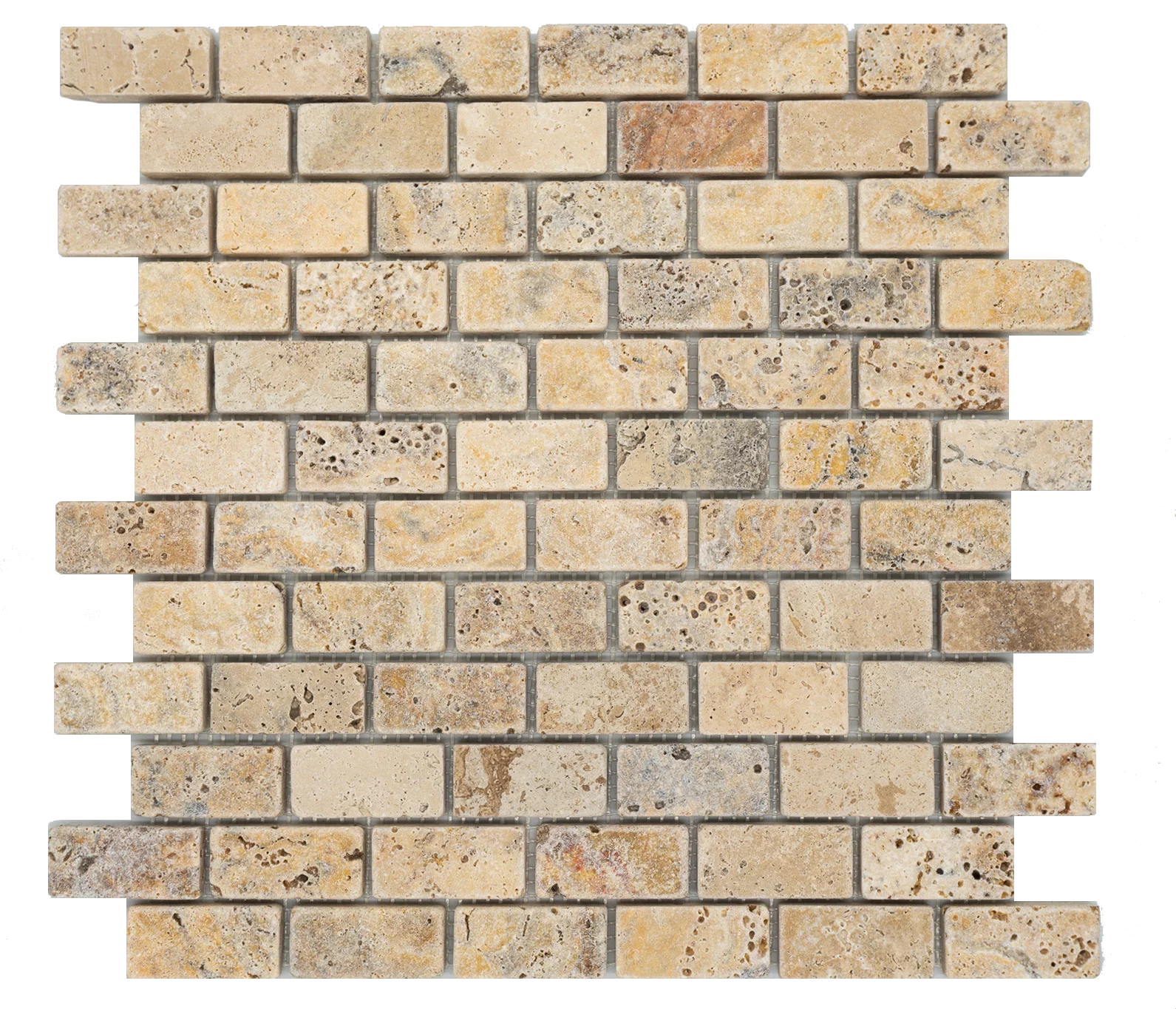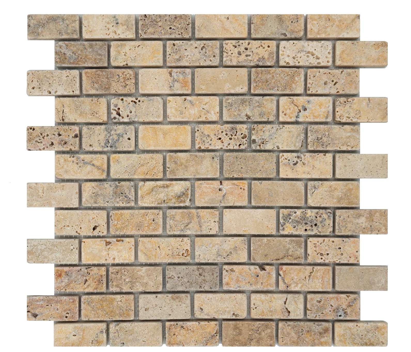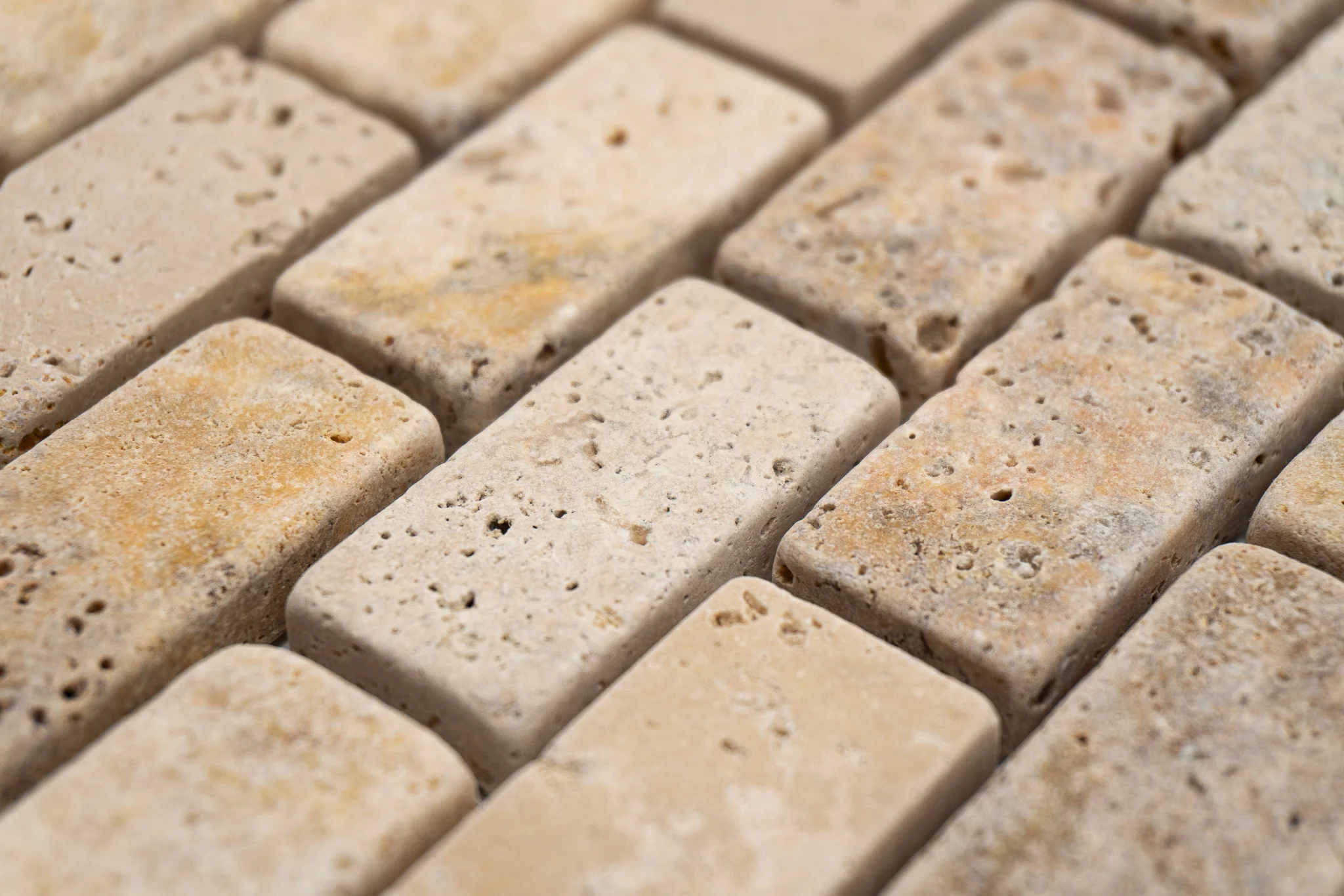 MOZAIC DIN TRAVERTIN, TUMBLED, PE PLASA, NECHITUIT, FORMAT DIN 2,3 X 4,8 , GROSIME 1 CM