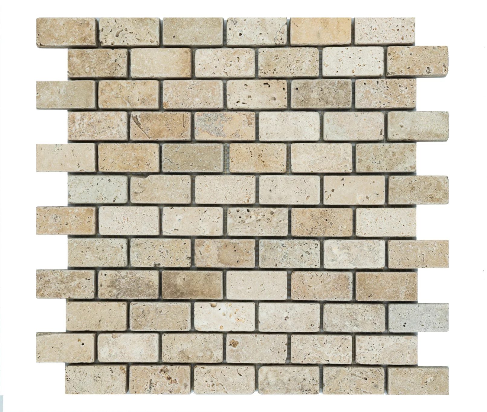 MOZAIC DIN TRAVERTIN LIGHT - 30.5x30.5x1 cm, bej, finisaj tumbled, format din placi de 2.3x4.8 cm, montat pe plasă, ideal pentru decoruri naturale, interior și exterior.