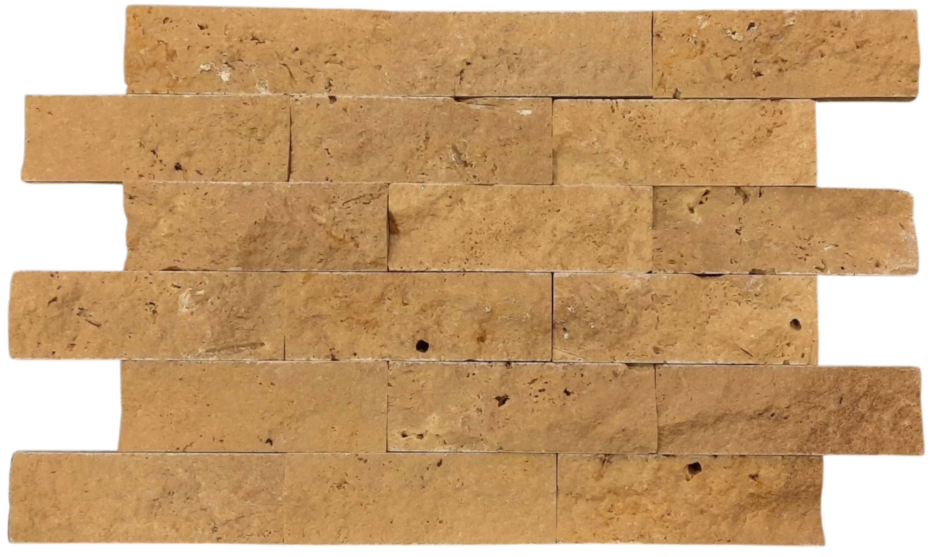 TRAVERTIN NOCHE - 5X15 cm, grosime variabilă 1.5-1.8 cm, în nuanțe calde de maro. Placaj decorativ ideal pentru pereți interiori și exteriori, cu un aspect rustic și textură naturală.
