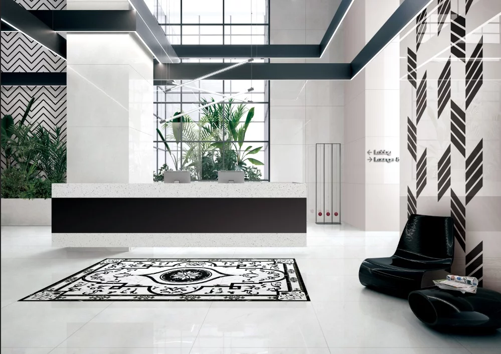 COVOR CERAMIC FC-66PBP36-2104 (6PLACI) - 120X180 cm, model monocrom cu motive clasice și contrast elegant alb-negru. Format din 6 plăci lucioase, ideal pentru spații rafinate.