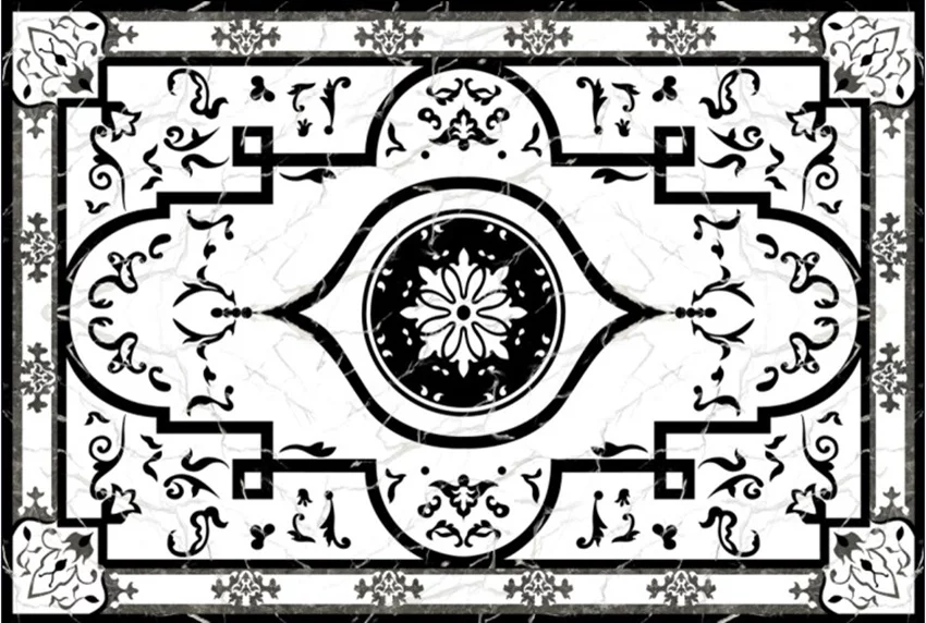 Modelul monocrom, în alb și negru, se remarcă printr-un design simetric cu motive clasice și accente florale stilizate, toate încadrate într-un chenar bine conturat.