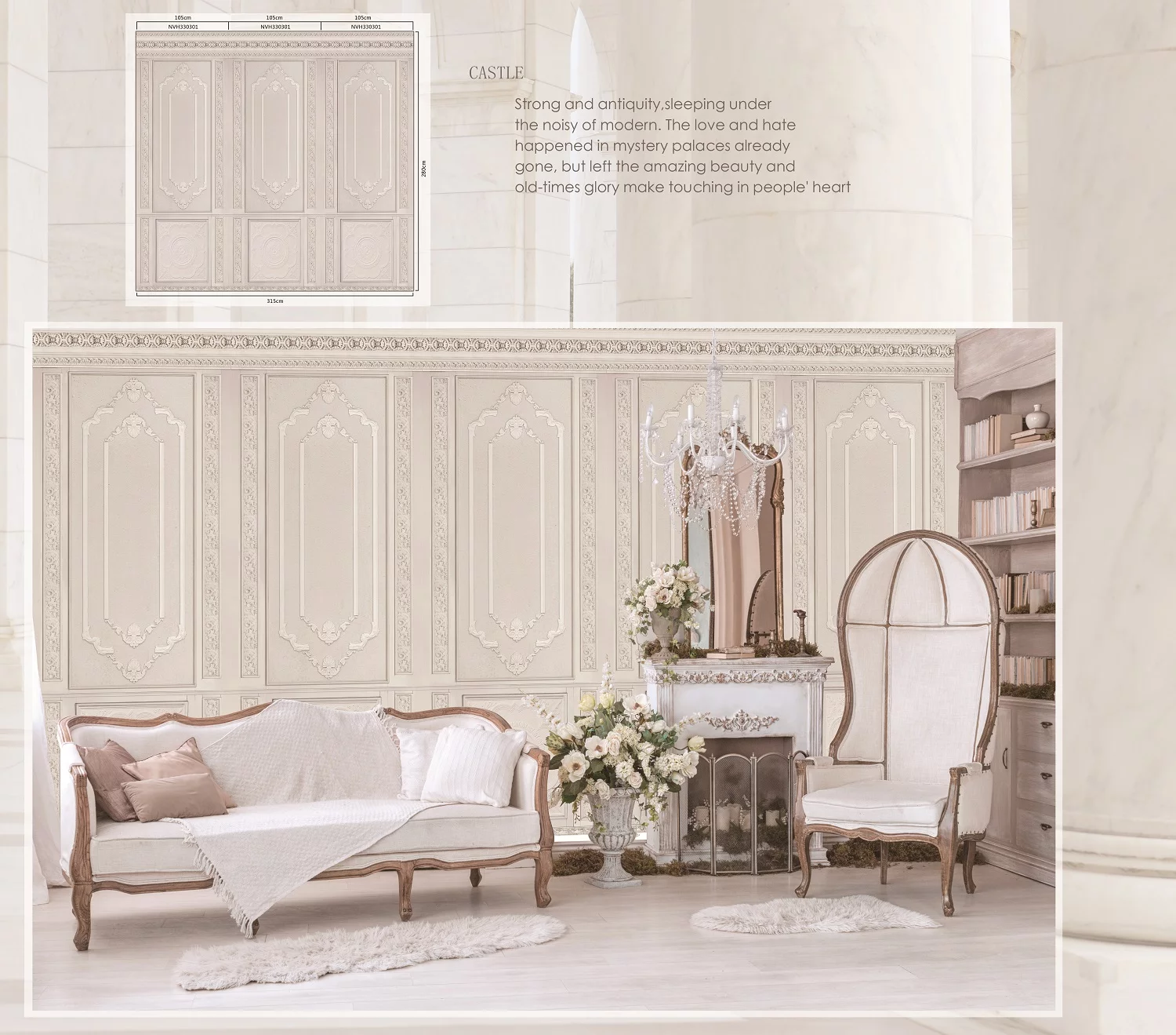 Realizat din hârtie mată, acest tapet reproduce cu finețe panotările decorative inspirate din interioarele aristocrate.