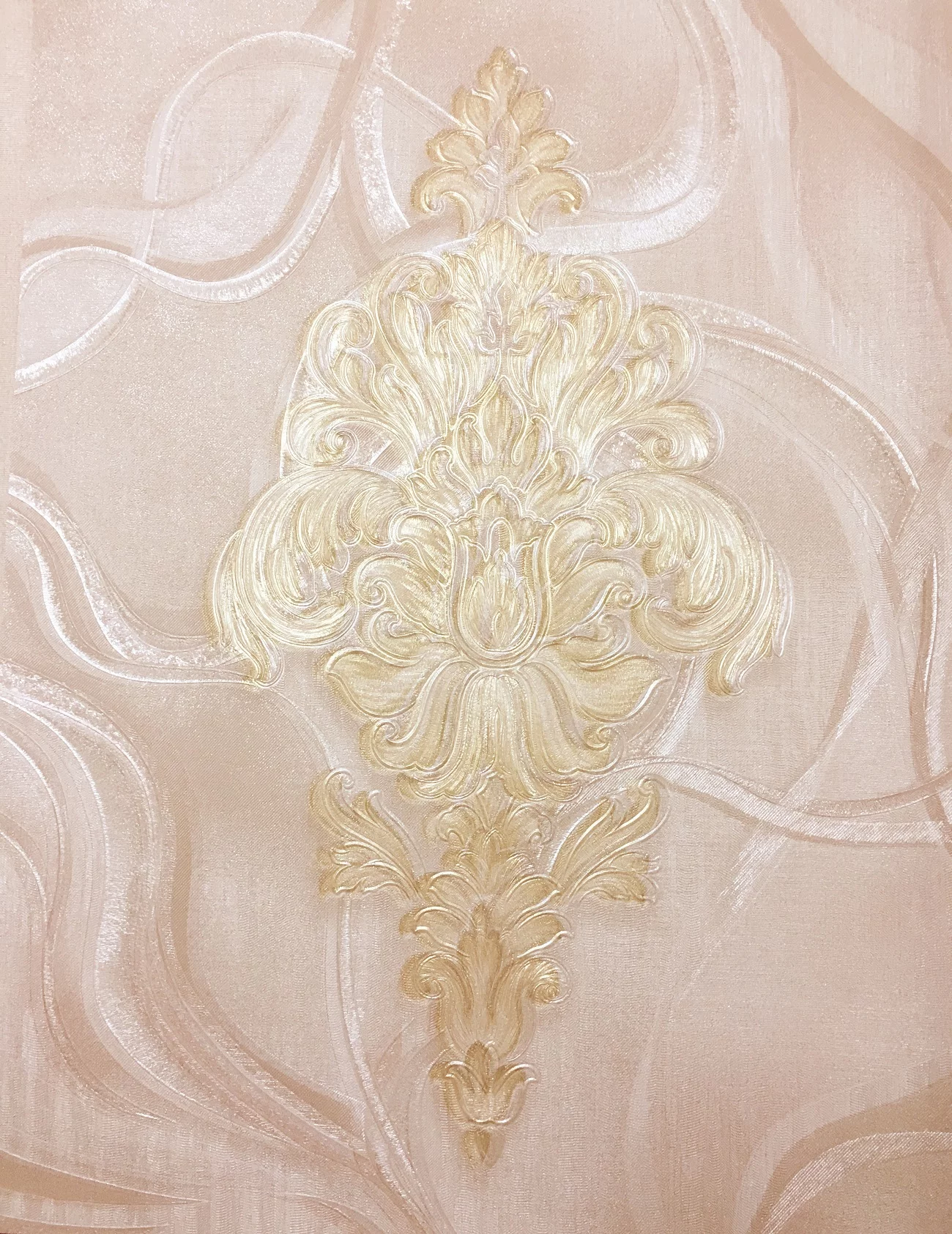 Designul baroc central, în nuanțe strălucitoare de auriu, este evidențiat pe un fundal nude satinat cu textură ondulată, ce creează un efect vizual spectaculos.