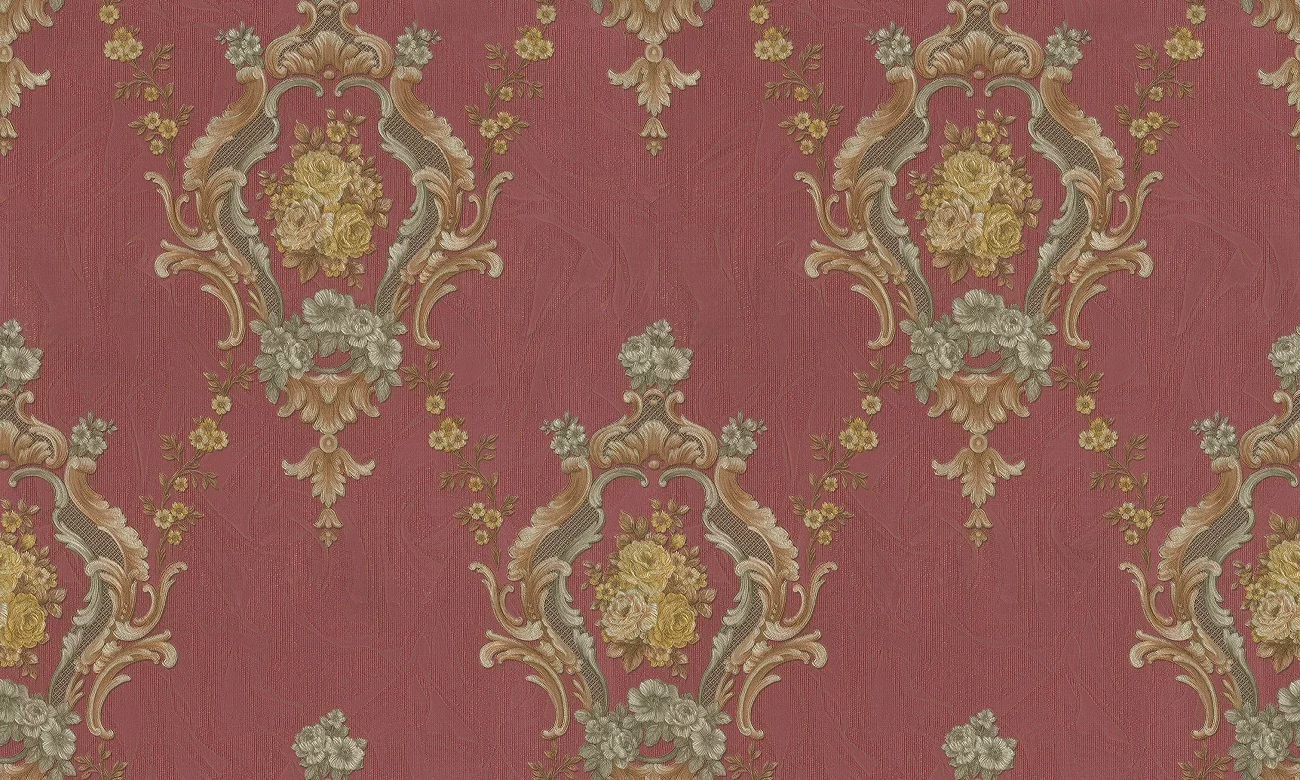 Fundalul într-o nuanță intensă de roșu rubiniu este pus în valoare de un model floral baroc încadrat în medalioane simetrice, cu detalii aurii, crem și bronz.
