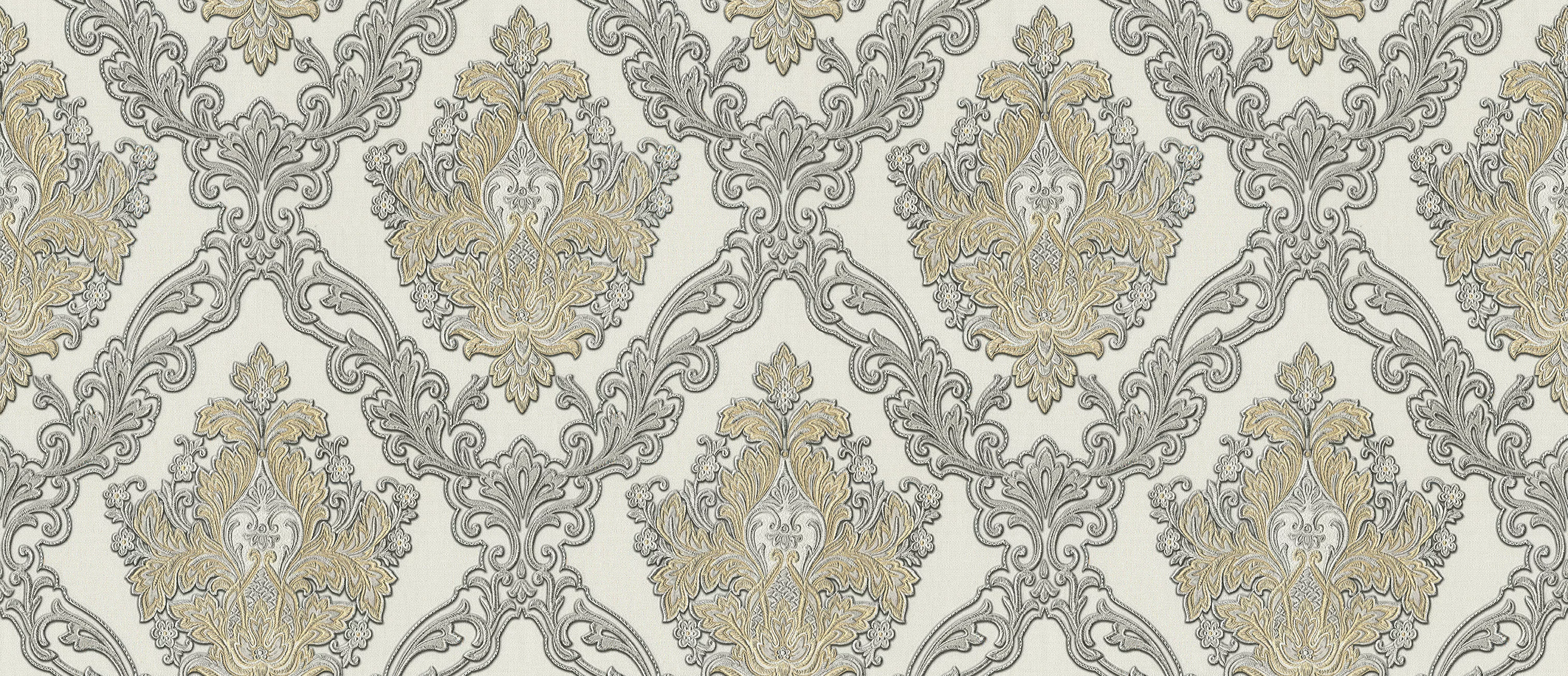 TAPET PVC ROYAL 95038 aduce un aer regal și impunător în orice spațiu, datorită modelului damasc complex, în relief pronunțat, cu detalii aurii și contururi argintii elegante.