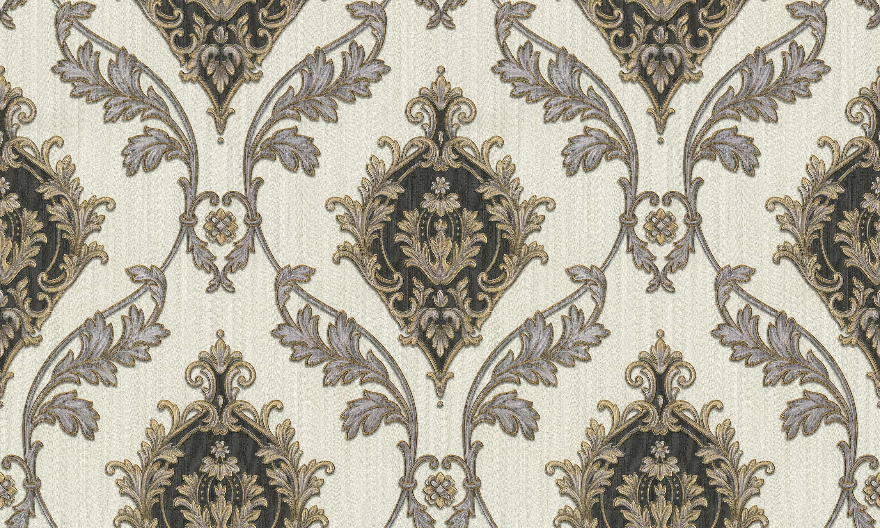 Modelul damasc baroc este conturat cu precizie pe fundal crem-ivory, fiind evidențiat de medalioane cu fond negru și detalii aurii, argintii și gri lavandă.