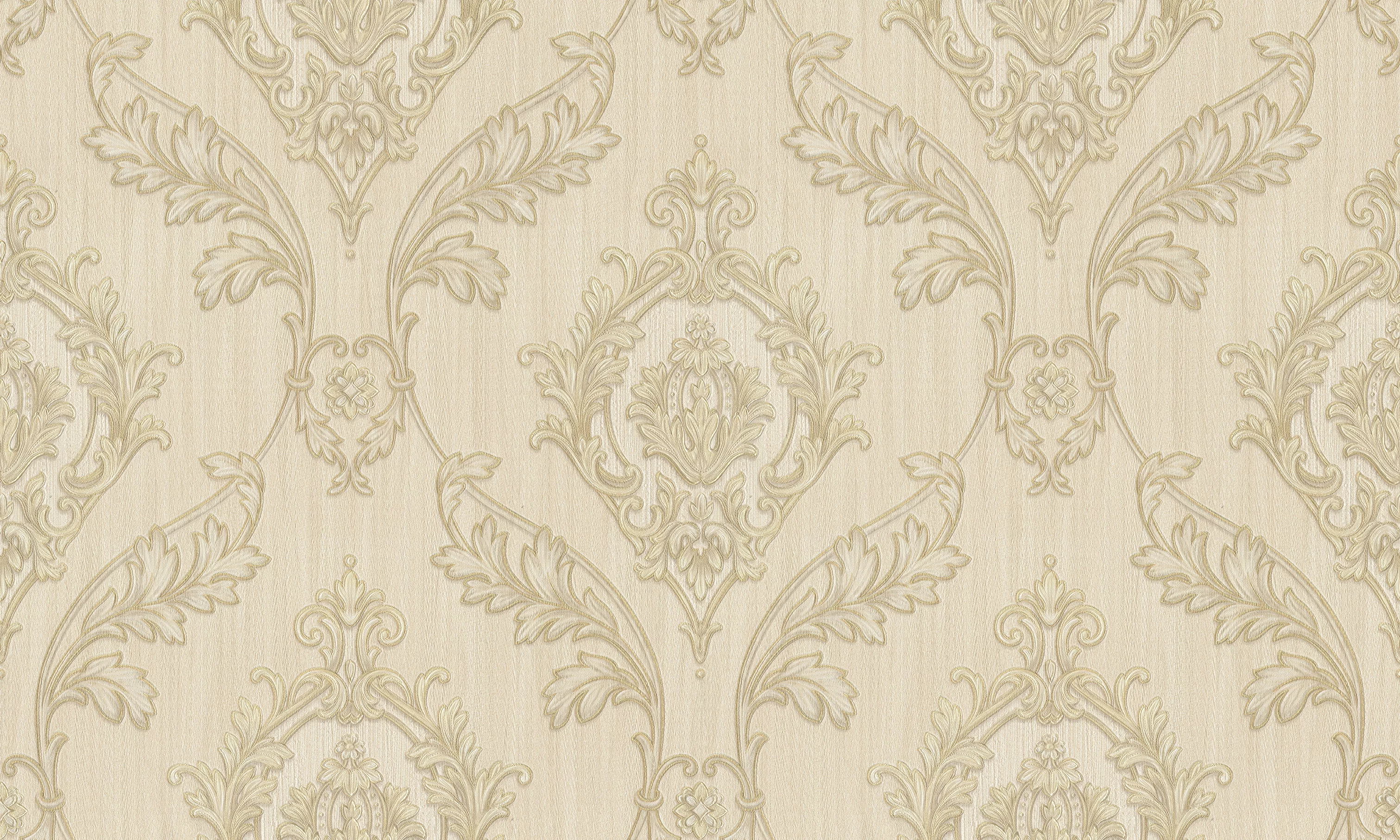 Designul baroc simetric, cu medalioane ornamentale în relief fin, se desfășoară pe un fundal bej deschis cu textură subtilă de lemn.