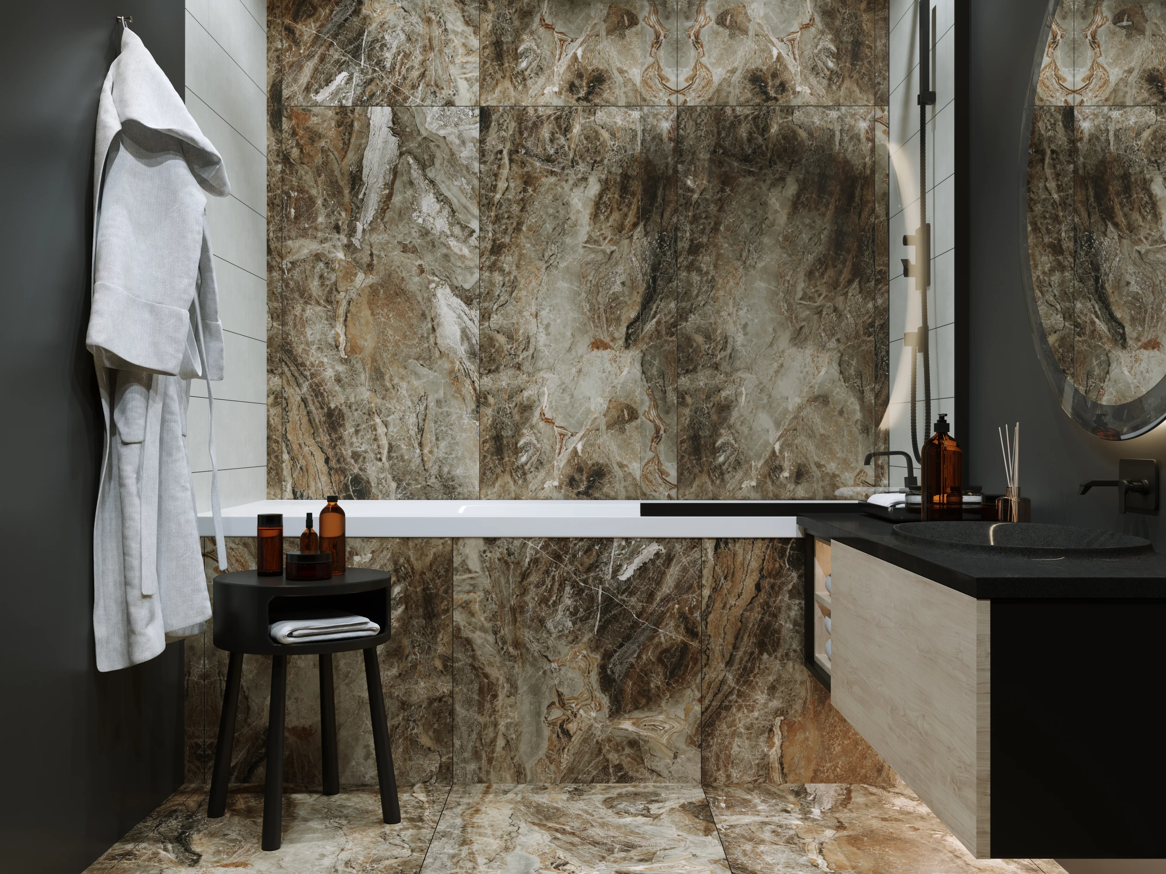 Gresie VESUVIO BROWN impresionează prin nuanțele sale bogate de maro și bej arămiu, îmbinate cu vene contrastante ce redau fidel textura și dramatismul rocilor naturale vulcanice.