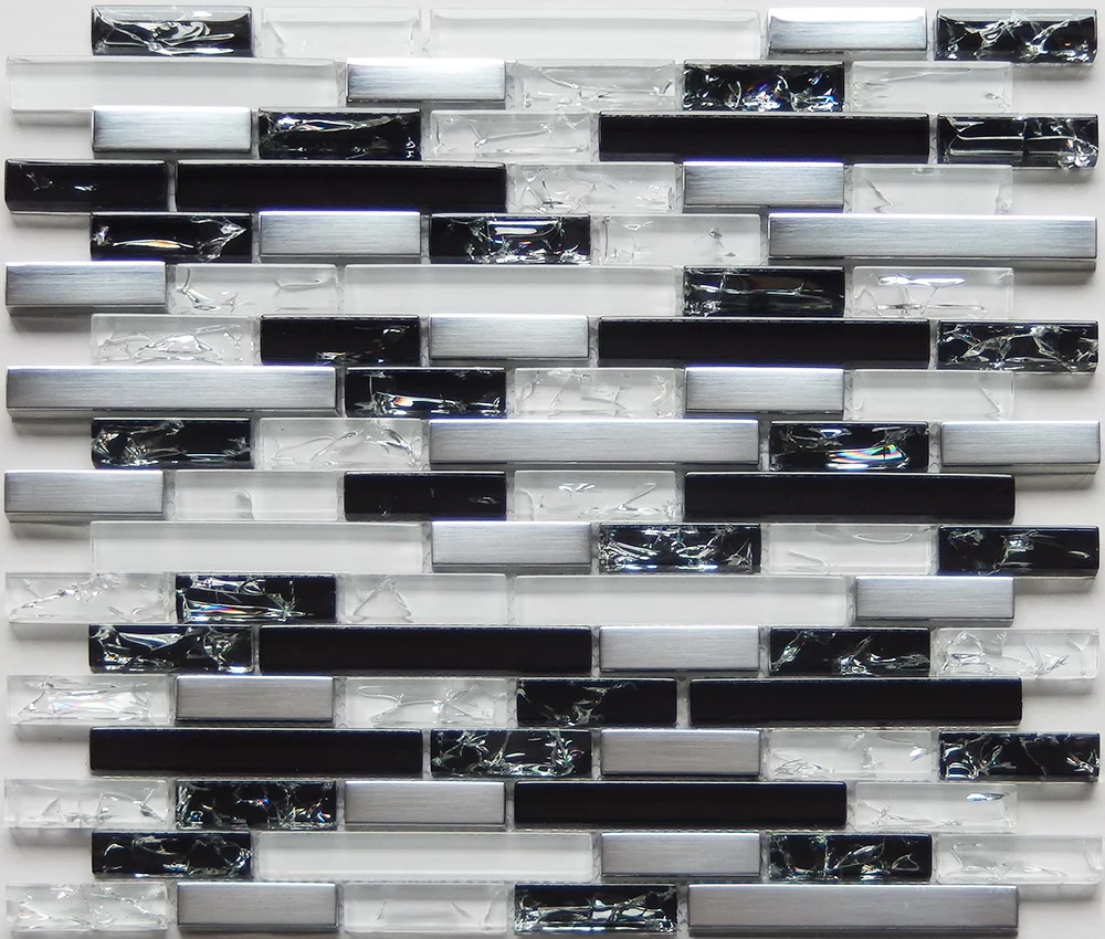 Mozaicul din sticlă WA361 este o alegere rafinată pentru amenajările interioare moderne, datorită combinației elegante de culori: negru intens, argintiu metalic și sticlă transparentă cu efect spart.